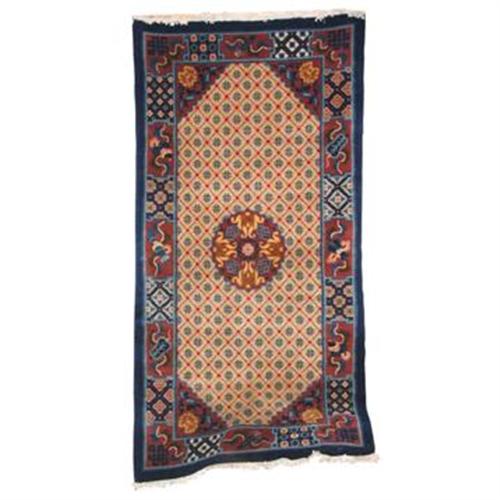 The collection we introduce to you is a exquisite pure wool rug with beautiful geometric pattern handmade in Tibet.Rugs and carpets are basic necessities in the Tibetan daily life.The high quality hand spun,vegetable dyed look,and the primitive but highly stylized patterns greatly appealed to westerners.Typically made for use as mats to sit on or for meditation,door and window covers,horse saddles,bed covers and pillar wrapping,the traditional Tibetan weaving generally reflect traditional Tibetan culture and religion.However,Chinese designs were also dominant as seen in the display of dragons,phoenix,clouds, floral and lotus images.