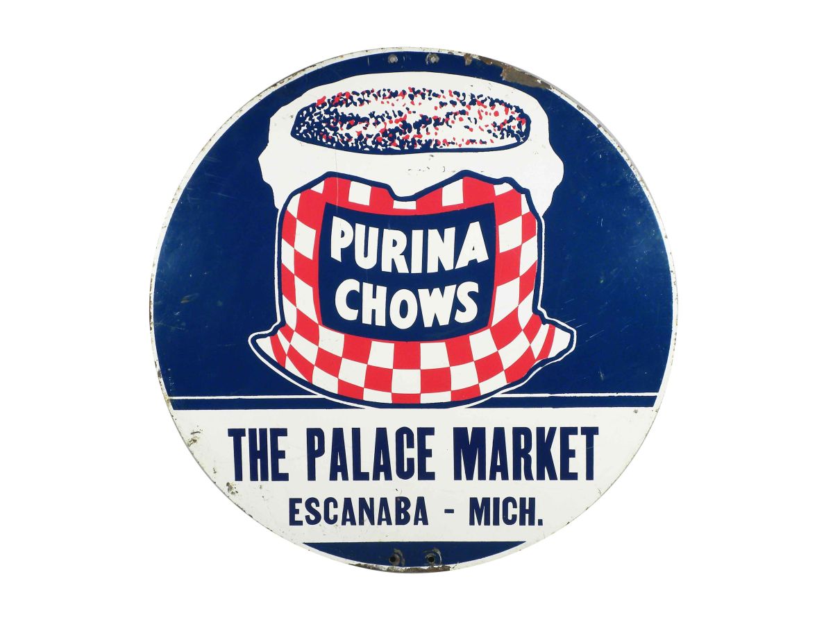 Purina Chows Round Tin Sign, the "Palace Market", Escanaba, MI. Some scratches otherwise good condition. 24 inch diameter.