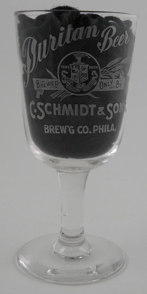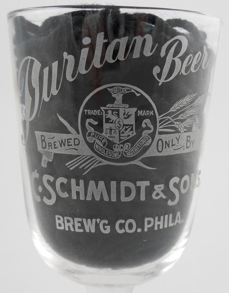 This is an etched glass for Puritan Beer from C. Schmidt & Sons Brewing Company of Philadelphia, Pennsylvania. They used this name from 1892 - 1920. It is 6-1/2 inches tall x 3-1/8 inches in diameter. The glass has no chips or cracks; it's as clean as you'll find!