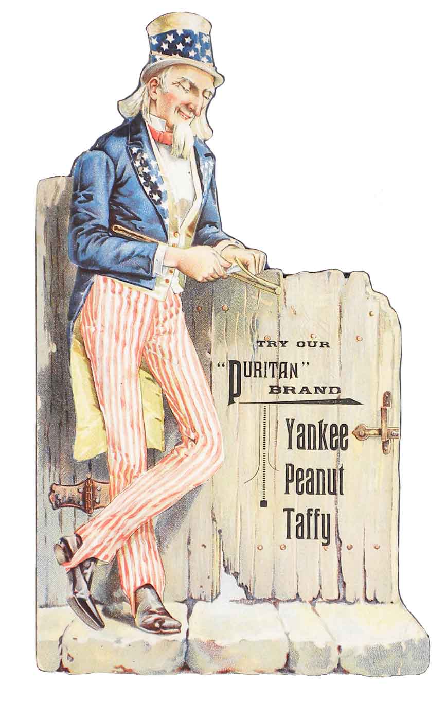 "Puritan" Brand Yankee Peanut Taffy Sign. Depicting Uncle Sam. Framed under glass. Near mint condition. 4 3/4 X 8 inches image only.