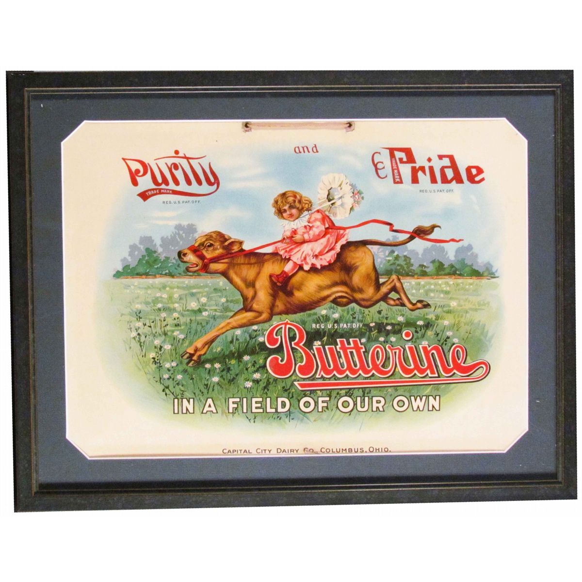 Purity and Pride Butterine celluloid string hanging sign. Capital City Dairy Co. Columbus, Ohio. Wear around string holes and minor loss at 6:00 and normal crazing, otherwise very good condition. Framed under glass. 3 3/4 X 10 inches, image only.