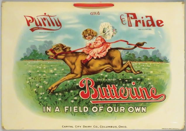 Purity & Pride Butterine Celluloid Over Cardboard Sign. Capital City Dairy Co. Columbus, Ohio. American Art Works, Coshocton, O. Minor edgewear otherwise excellent condition. 14 X 10 inches.