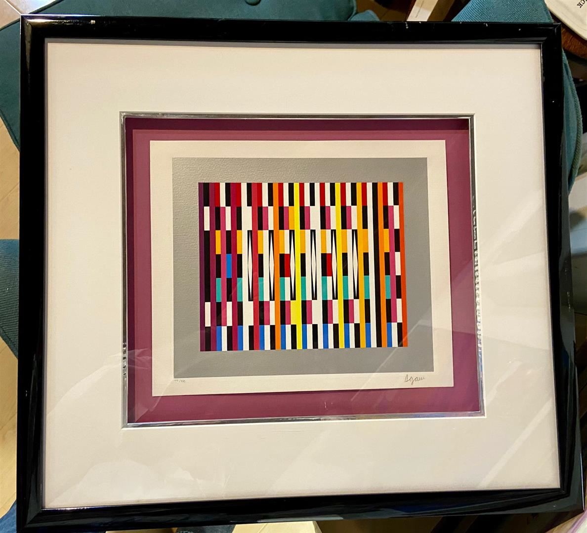 This is a classically float/ framed Agam serigraph on paper from his Martin Lawrence Galleries days. The 20.5x22.5" black lacquer molding shows some wear & tear