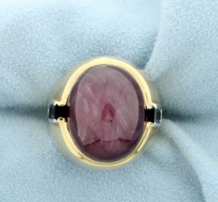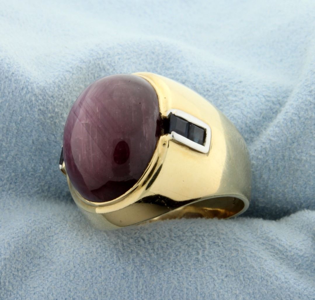 In 14K yellow gold there is a 20x16mm purple cats eye cabochon gemstone. Also this ring contains four 2.5mm square blue chrysoberyl gemstones in shank. Size 9 1/2 20.7g