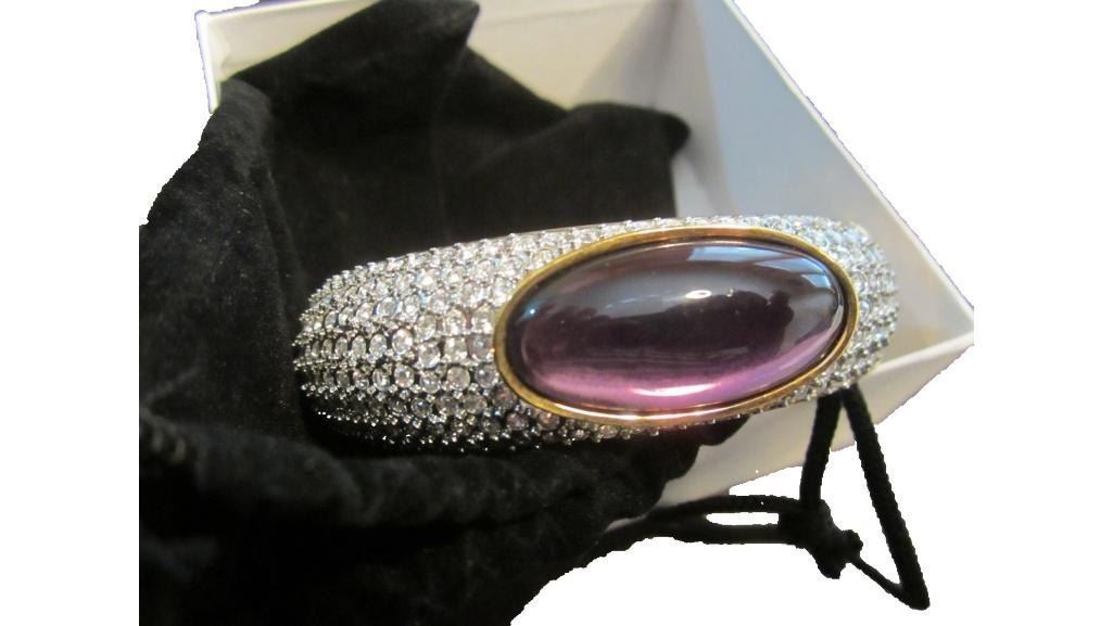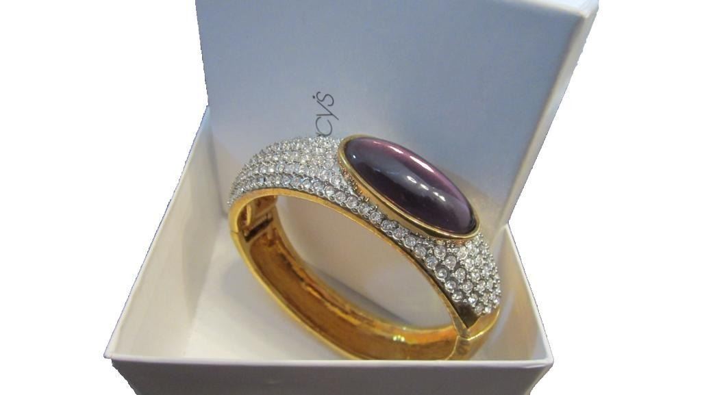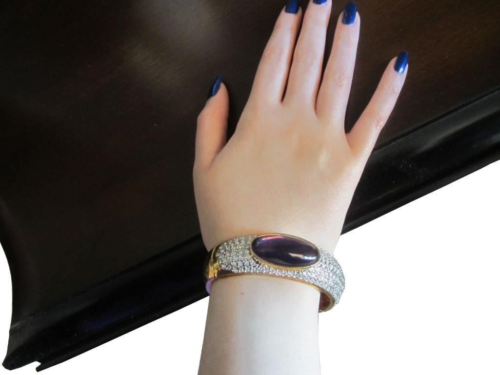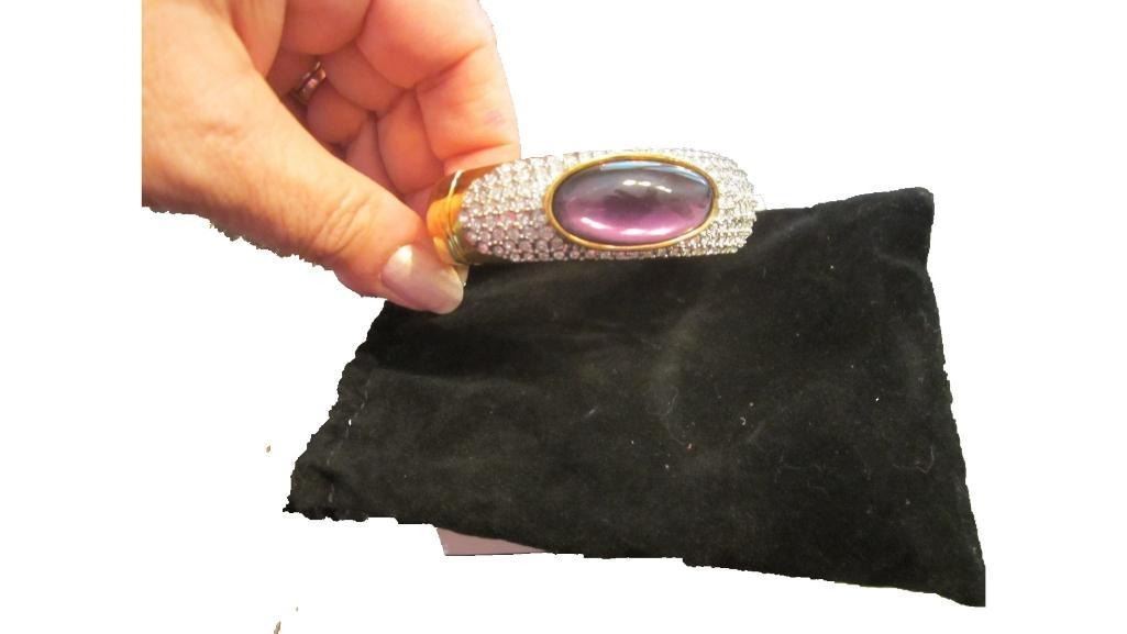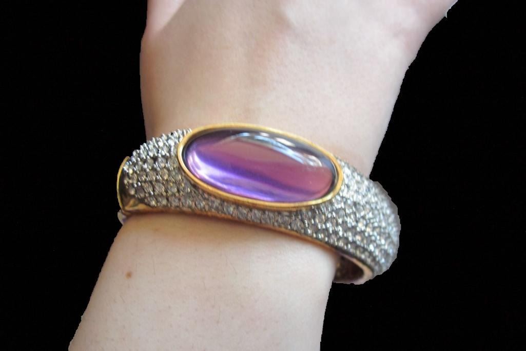 Upscale Designer Jewelry (Costume) Clear Rhinestone/crystal On Gold Tone Hinged Bangle Bracelet Large Purple Oblong Stone Very Bling! Excellent Condition, Unworn. Will Easily Fit A Larger Wrist Size Magnetic Closure On Hinge. Clasp Type: Magnetic - 10062-040618-EB-25862