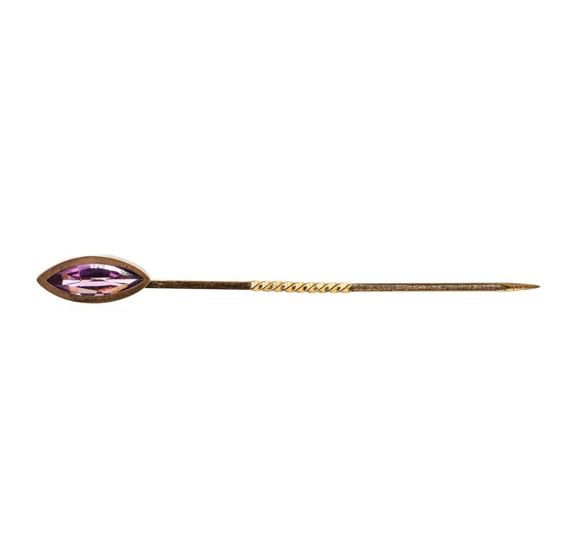 One yellow gold plated stick pin weighing 0.7 grams containing one purple crystal.