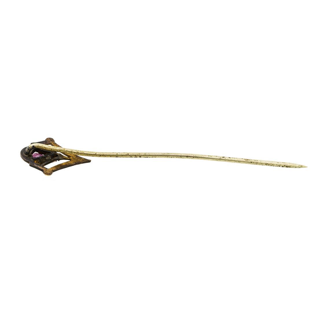 One gold plated stick pin featuring one purple crystal, total weight of 0.8 grams.