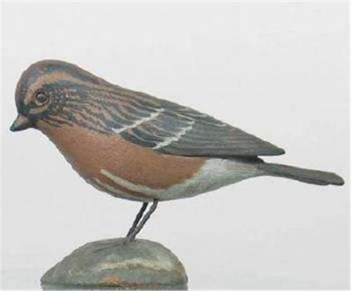 Purple Finch by Jess Blackstone has a rectangular gold label that reads; "Hand carved and painted by Blackstone". (decoy)