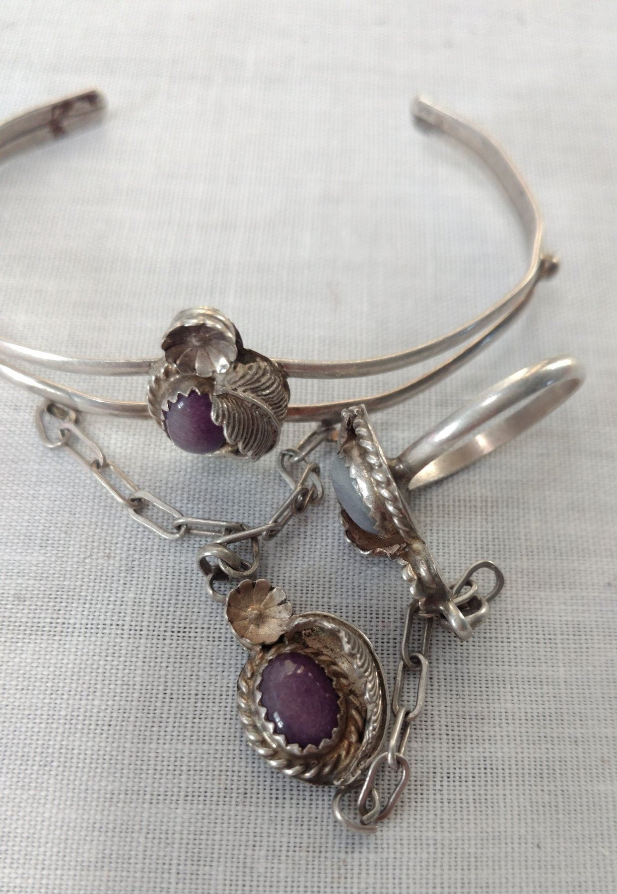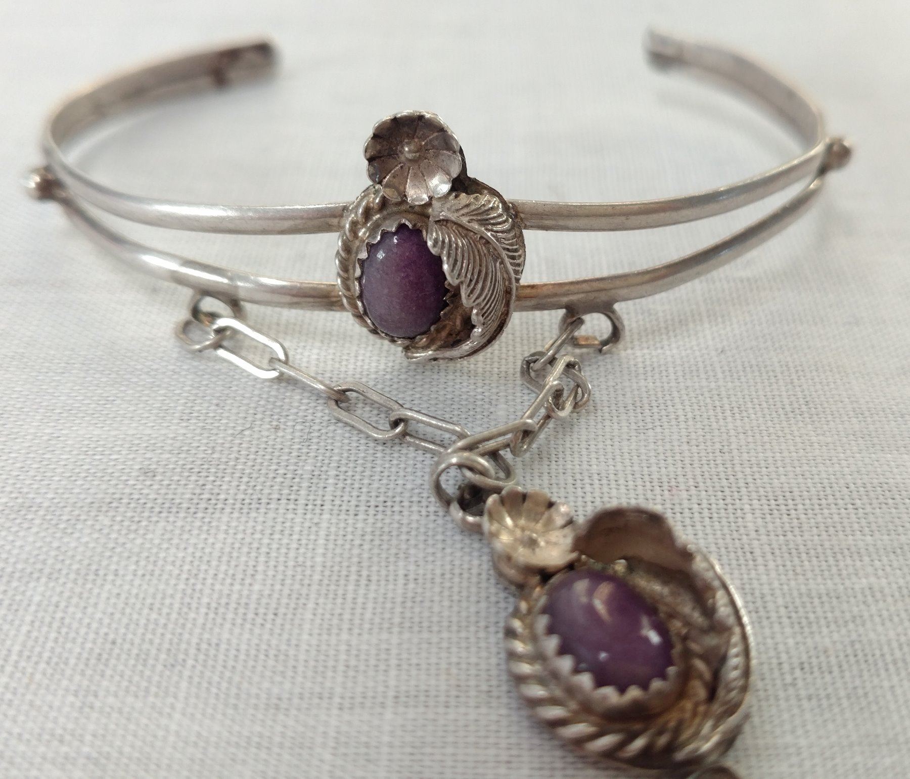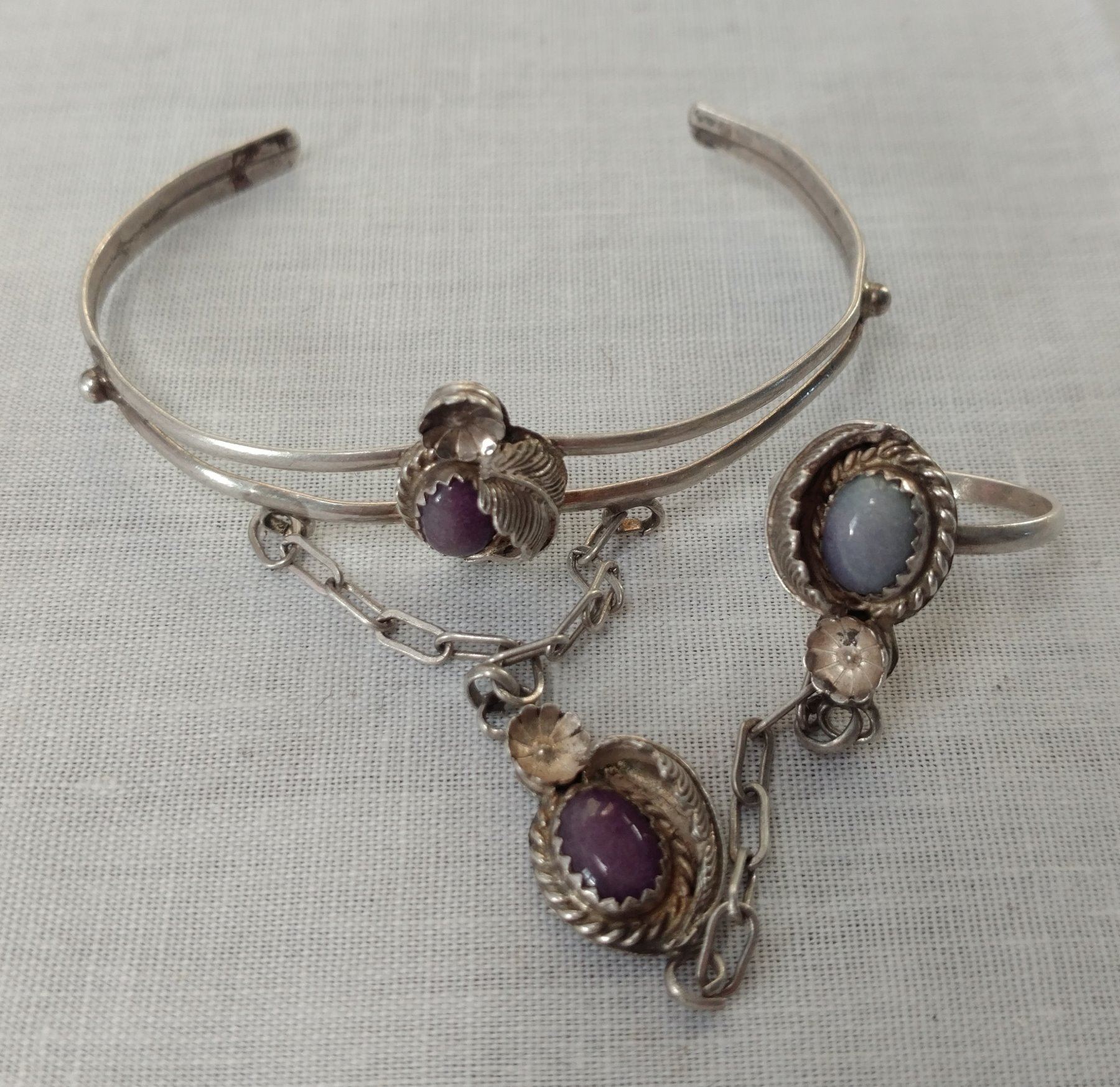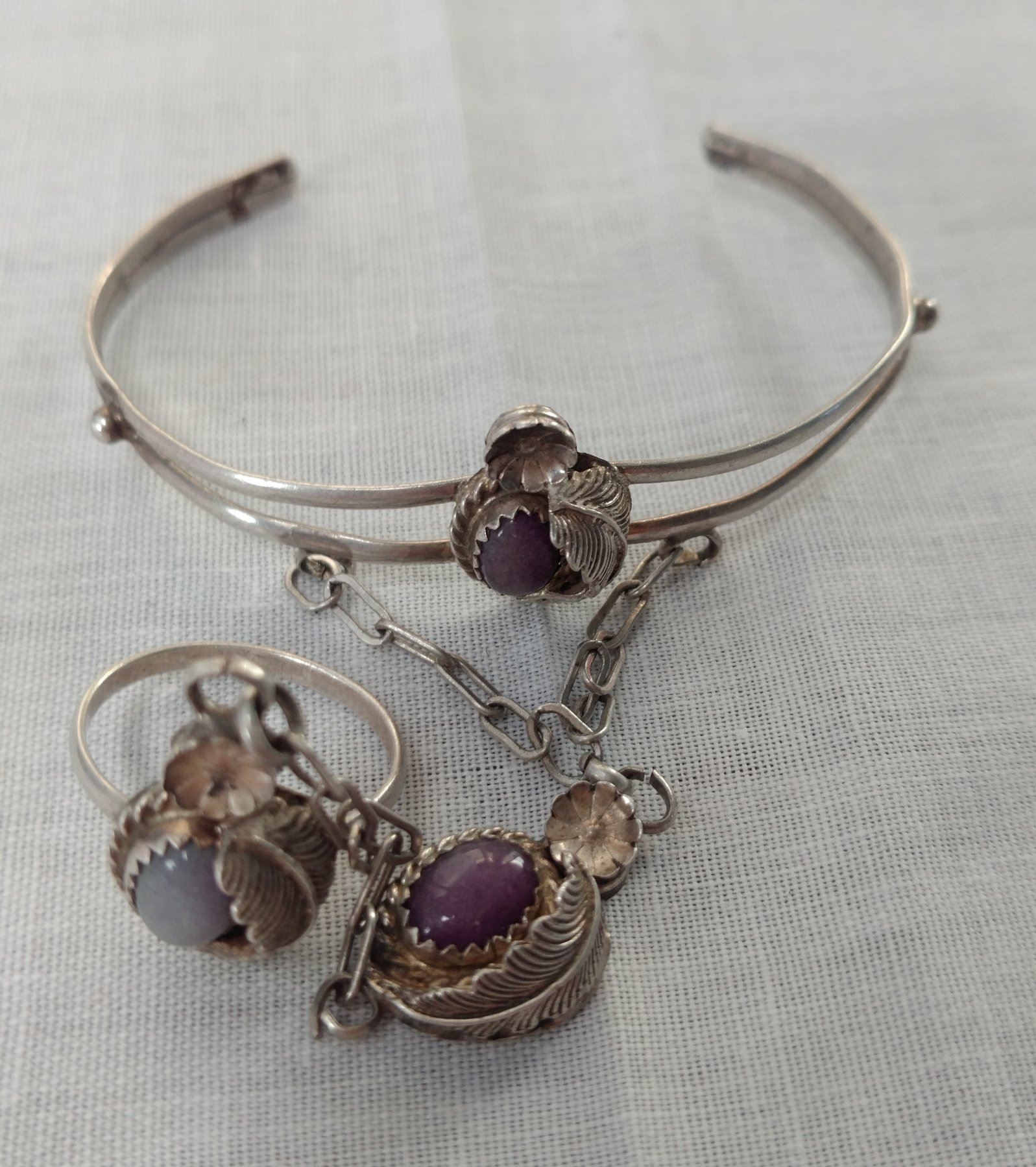 Purple Onyx Slave Bracelet, c. 1970s. Made of sterling silver and purple onyx, the cuff measures 2 1/2" x 1 3/4" x 3/8", with a 1 1/2" opening and a 5" inside measurement. The ring is a size 6, measuring 3/4" x 3/4" x 7/8". Approx. lot weight of 14 3/4 grams. Signed KC. Navajo. Condition: Good, see images. Shipping: $14.50 w/insurance and signature.