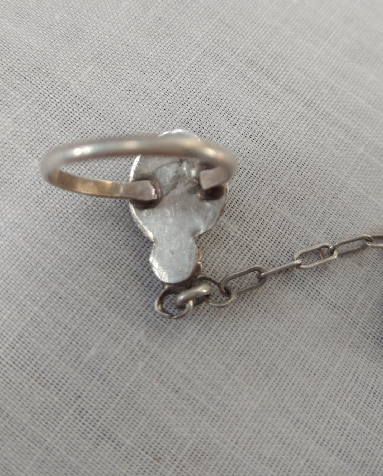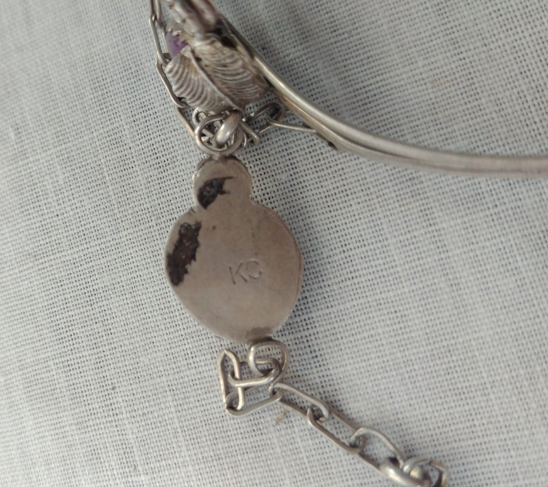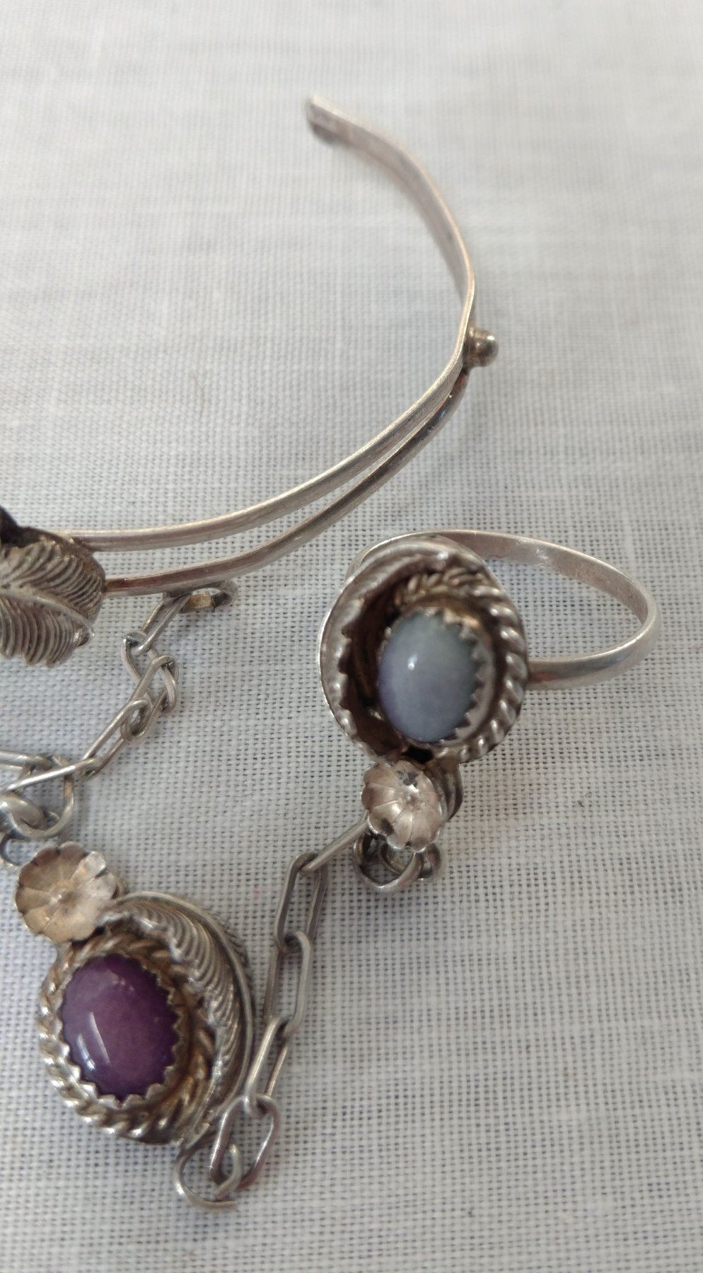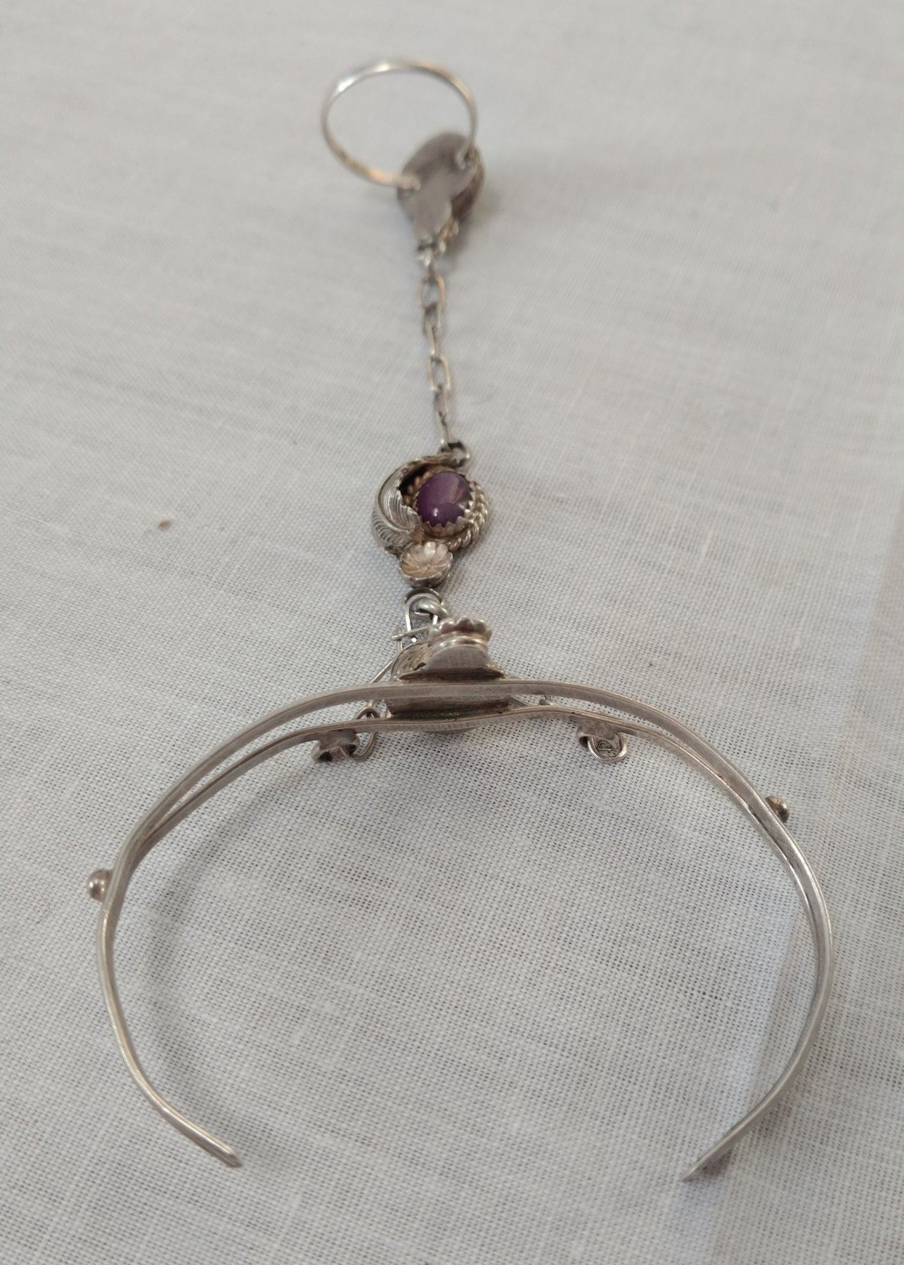 Purple Onyx Slave Bracelet, c. 1970s. Made of sterling silver and purple onyx, the cuff measures 2 1/2" x 1 3/4" x 3/8", with a 1 1/2" opening and a 5" inside measurement. The ring is a size 6, measuring 3/4" x 3/4" x 7/8". Approx. lot weight of 14 3/4 grams. Signed KC. Navajo. Condition: Good, see images. Shipping: $14.50 w/insurance and signature.