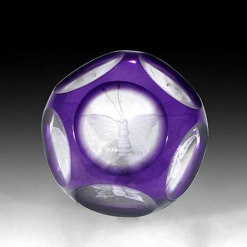 Faceted purple-flash overlay engraved butterfly paperweight. The piece contains an engraved butterfly, within a purple-flash overlay, with five and one facets. Diameter 3".