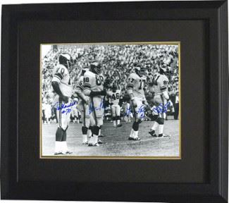 The Purple People Eaters was the nickname of the Minnesota Vikings football team's defensive line of the late 1960s to the late 1970s, when the Vikings played in four Super Bowls. The Purple People Eaters are Alan Page (9 Pro Bowl Selections, NFL MVP, and Hall of Famer), Carl Eller (6 Pro Bowl Selections and Hall of Famer), Jim Marshall (2 Pro Bowl Selections), and Gary Larsen (2 Pro Bowl Selections) The Purple People Eaters were a big factor in the post-season success of the Vikings from the late 1960s through the 1970s. This Minnesota Vikings 16X20 photo was hand signed by the Purple People Eaters: Carl Eller (with HOF 04 inscription), Alan Page, Jim Marshall, and Gary Larsen. Certificate of Authenticity from Athlon Sports. Custom White Mat and Black Color Framed as shown.