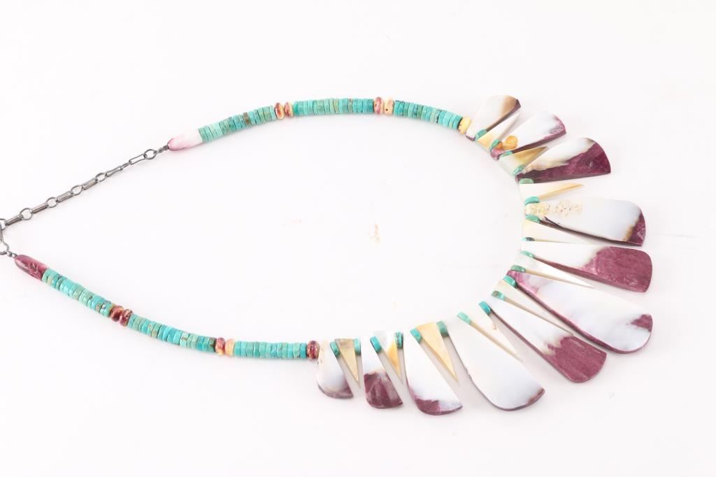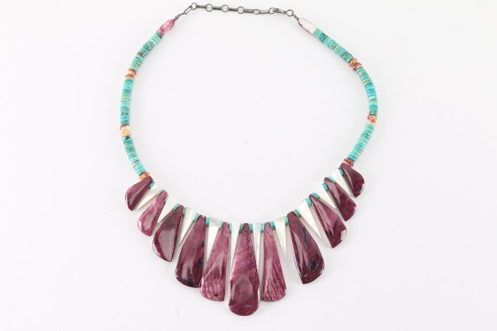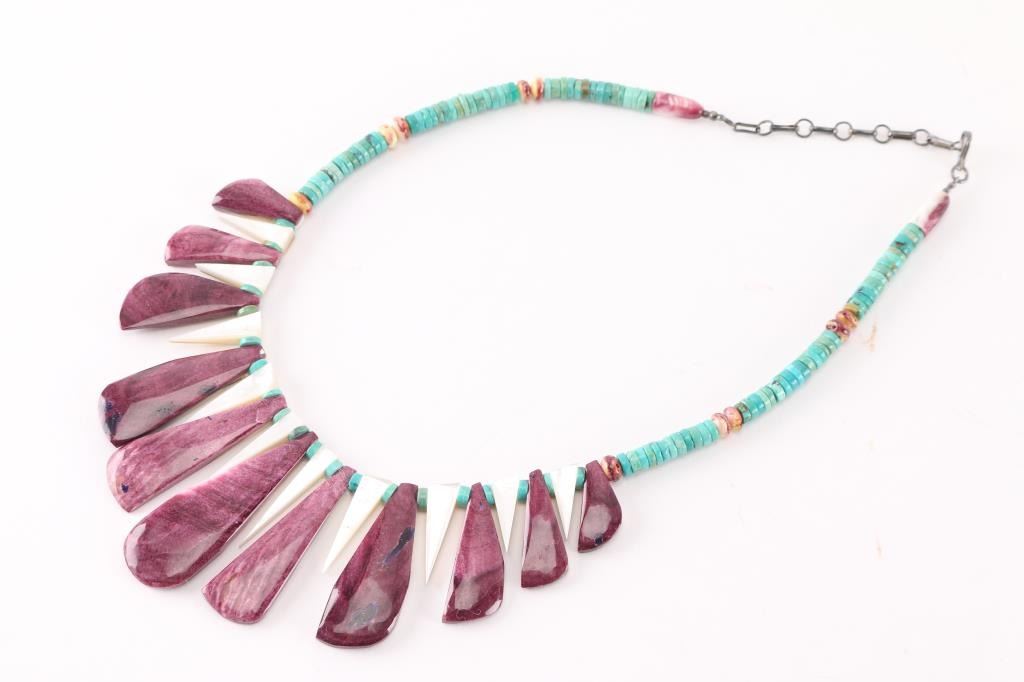 Beaded Necklace with turquoise heishi beads accented with mother of pearl beads.