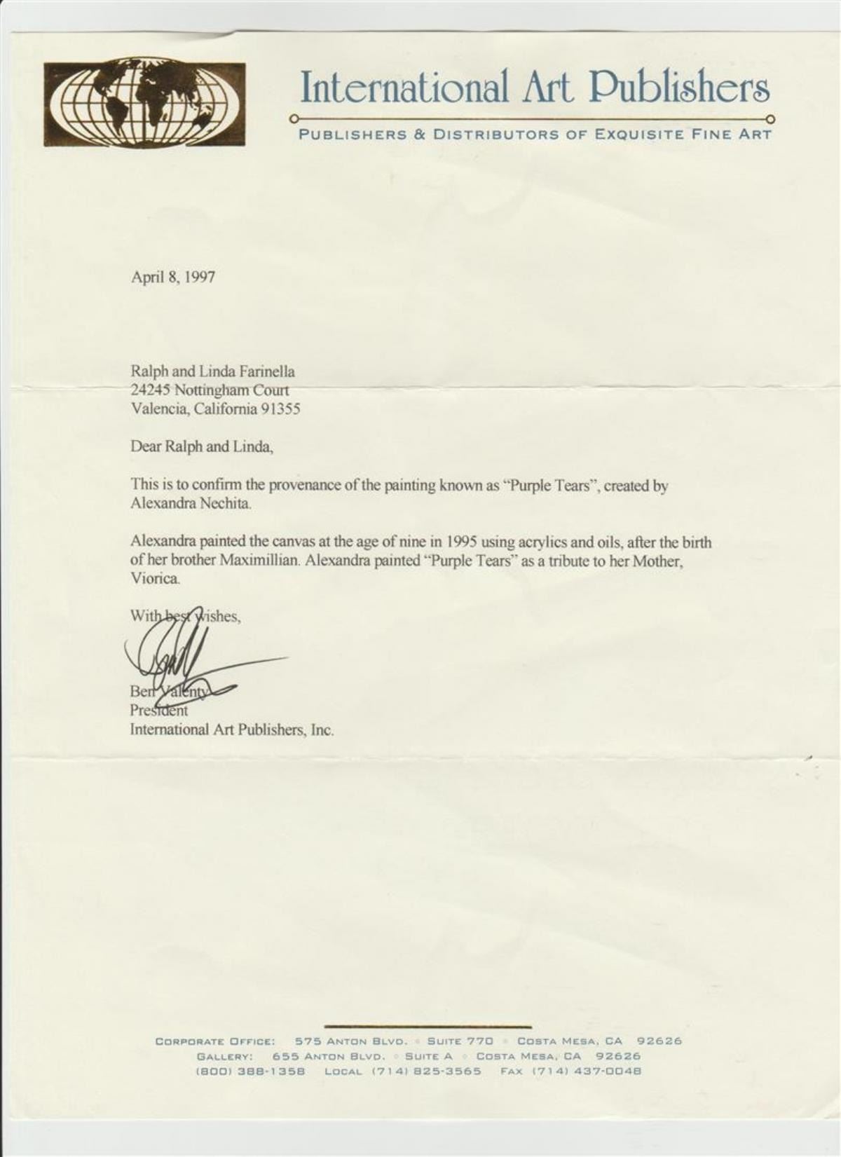 Alexandra Nechita - Purple Tears Original - 1995 - 20" H x 16" W Comes with Certificate of Authenticity.