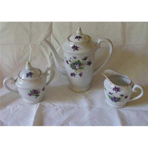 Beautiful Teapot with matching Creamer and Sugar Bowl & Lid with purple violets, trimmed in gold. Although it isn't marked, pretty sure it's Japan. Teapot is 7 1/2" tall. Just gorgeous! Tiny chip on spout of teapot, that you can't really even see.