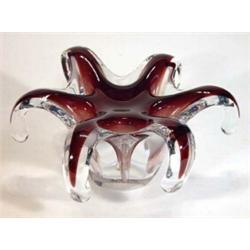 Purple and clear Art glass scalloped vase, signatures and marks to base, 20cm diameter