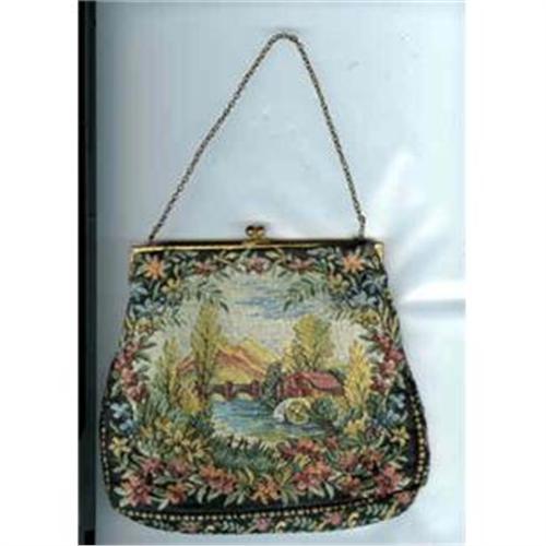 6" X 7" Brass frame. Satin Lining. Brass chain handle. Tapestry Purse depicting a water wheel and a bridge, mountains and flowers.