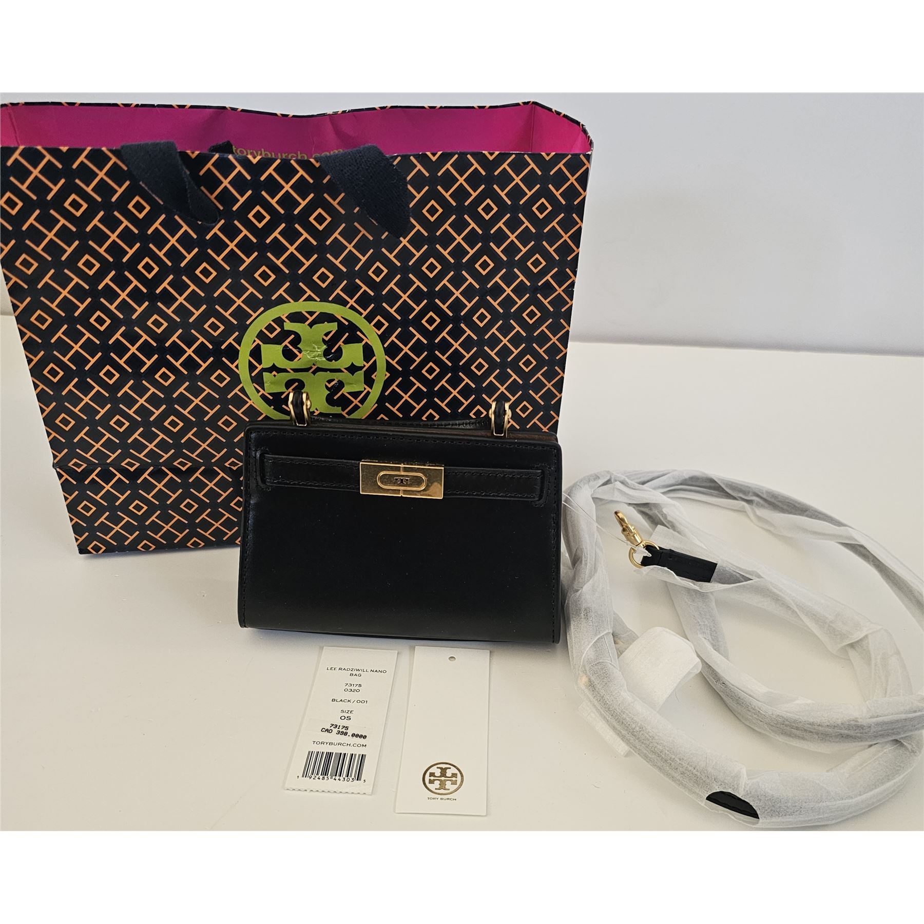 Tory Burch Compact black leather wallet with detachable cross-body strap, brand emblem, new with tags.