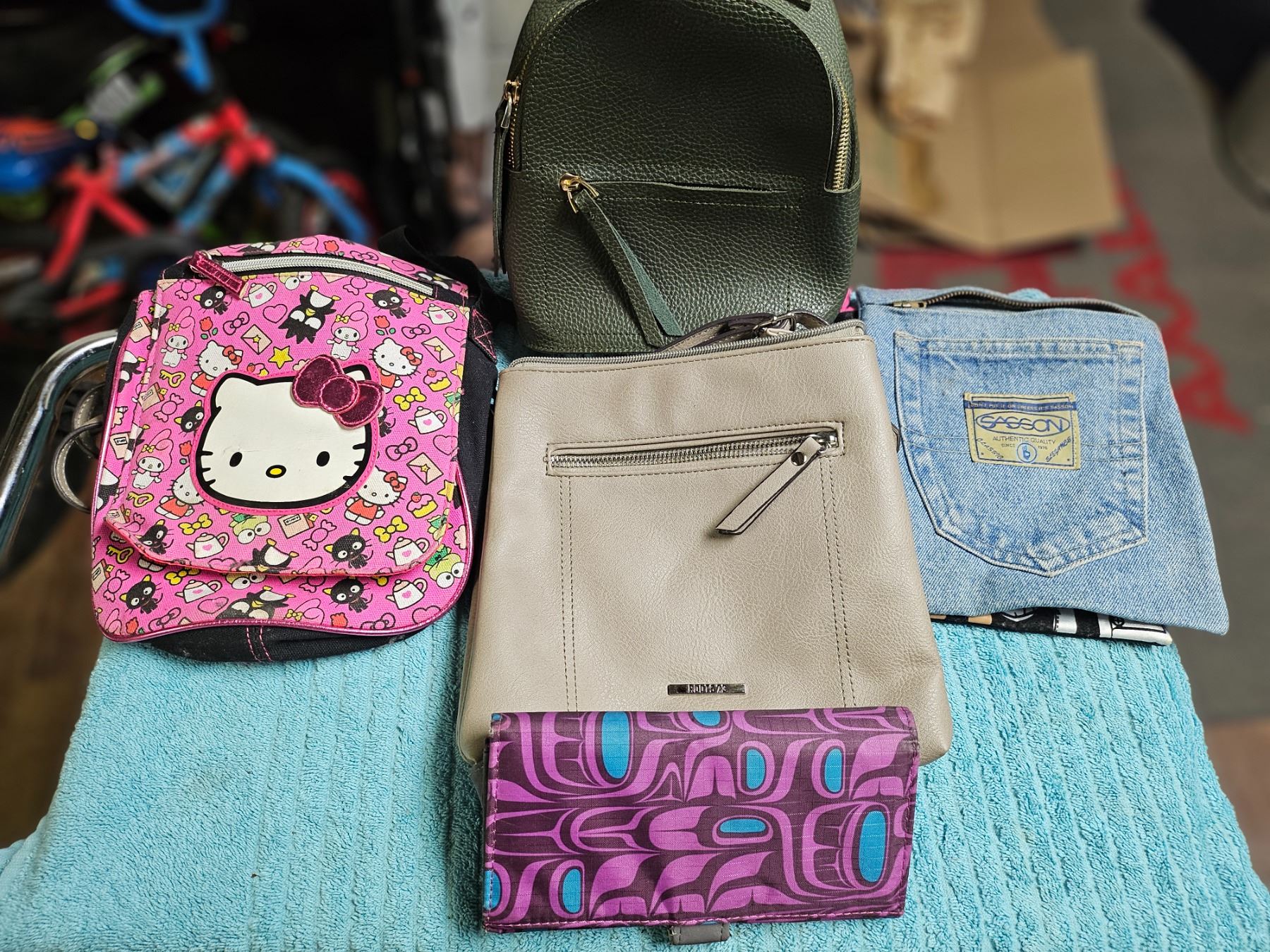 Hello Kitty, Roots, sassoon and other purses/bags and one wallet