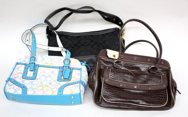 (lot of 3) Two Coach style purses in black canvas monogram and multi-color monogram, together with a faux brown alligator shoulder bag