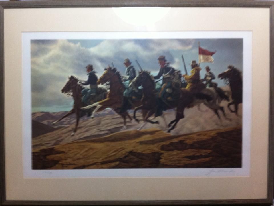"Pursuit and Attack" by artist Joe Ruiz Grandee (1929-1979), lithograph signed in pencil in the year 1974. Framed 24" x 32" Image size 22" x 30". Artist, Joe Ruiz Grandee as born a third generation Texan born in Dallas in 1929. He studied at the Aunspaugh Art School in Dallas during 1947. From 1965 to 1991, he was active as a sculptor, illustrator, and painter of portraits, military scenes, and the history of the West. He has been cited for historically accurate depictions of the Dragoons and Cavalrymen of the U. S. Army. In 1974 Joe Ruiz Grandee was honored as the first official state artist for the State of Texas an appointment by the Texas Legislature.in which he served for one year. Joe Ruiz Grandee was also the first artist to show in Washington D. C., and considered a leading expert on the American West. His work has been exhibited by the White House, The Harmsen Collection of Western Art and the National Cowboy Hall of Fame. His original works are rare and valuable.