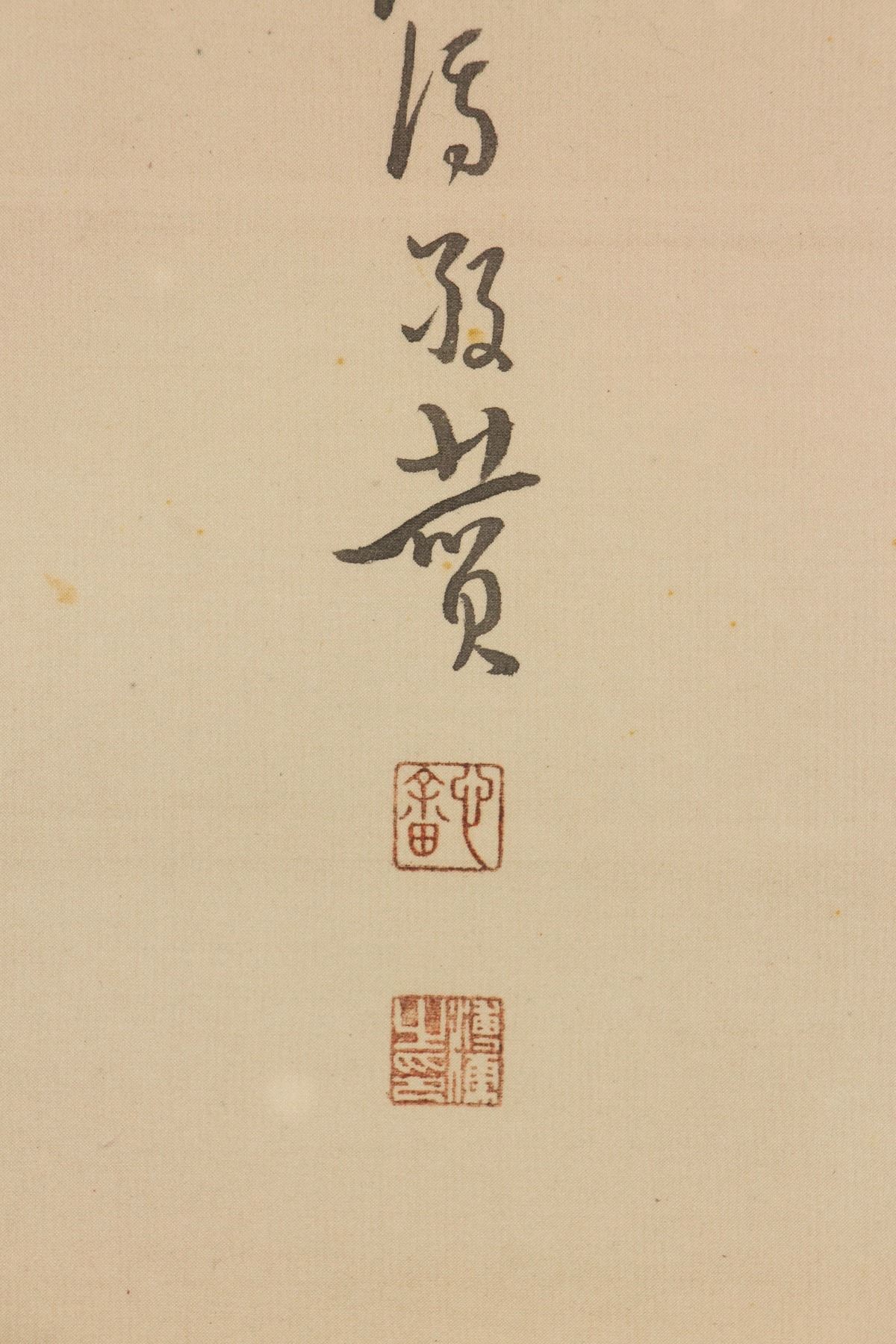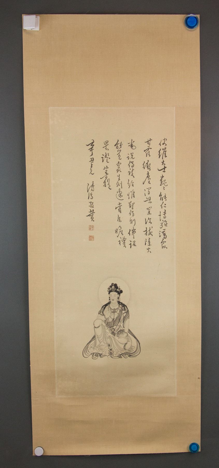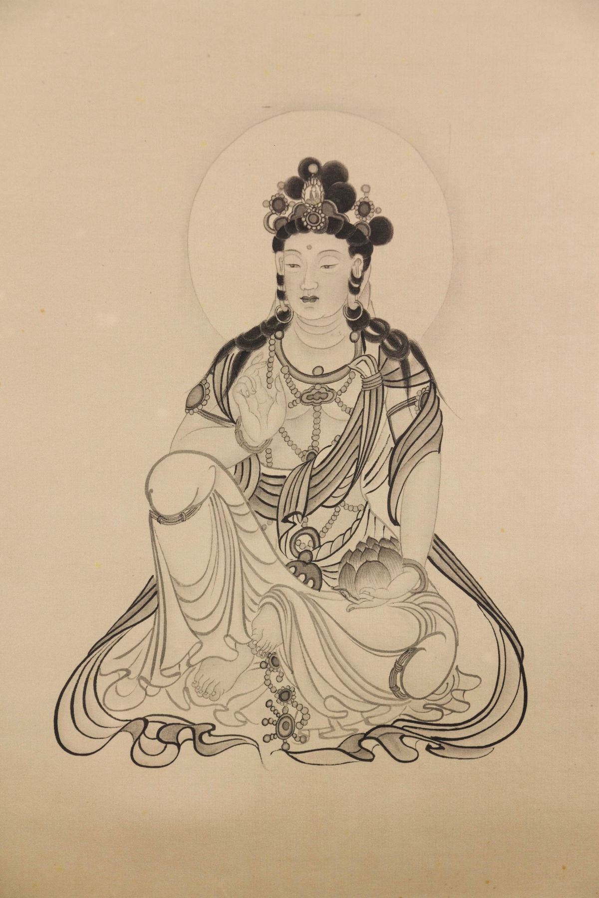 Painting of semi-sitting Guanyin with aurora; Chinese ink on paper roll; signed Puru (1896-1963); inscribed with 2 artist seal, 81 cm x 34.5 cm