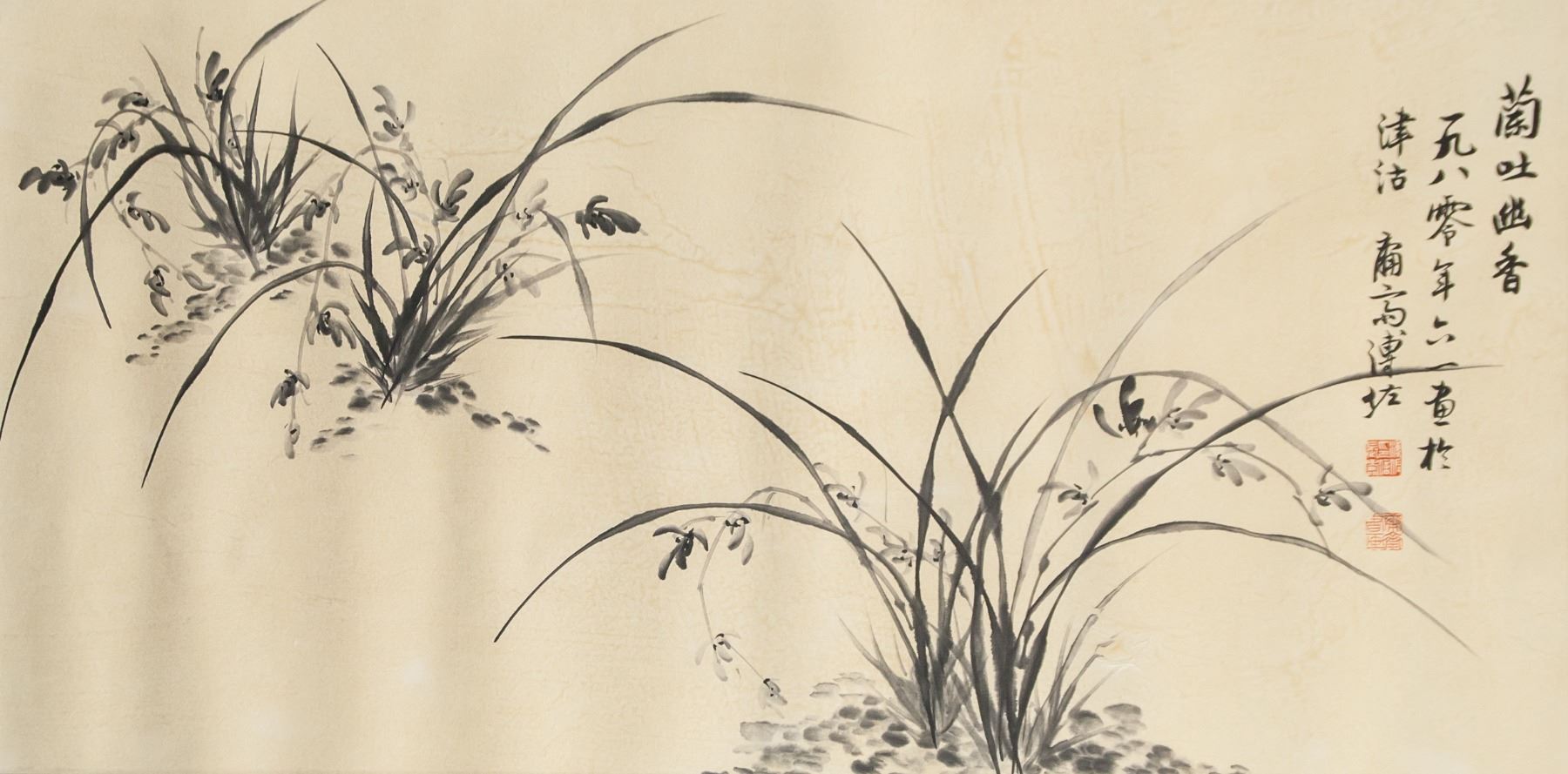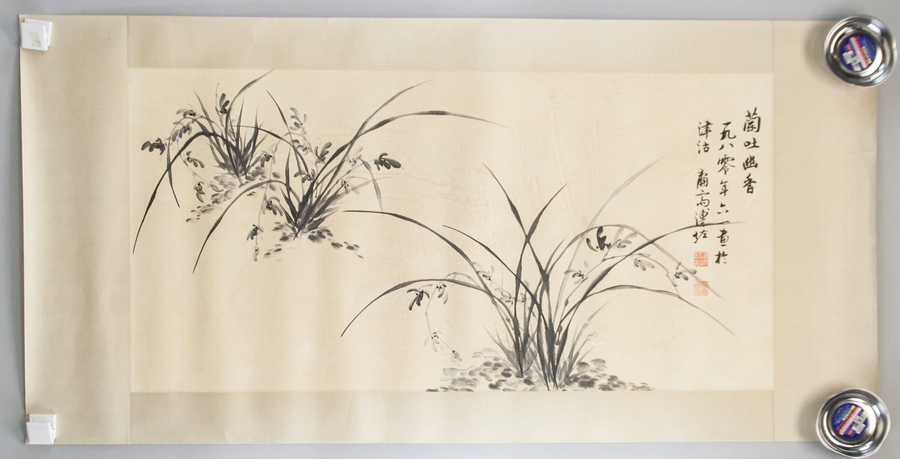 Chinese ink and watercolor on paper. Featuring three clumps of wild grass. Signed to the right. Inscribed with two seals. Attributed to Puru (1896-1963, Chinese). 47 x 95 cm.