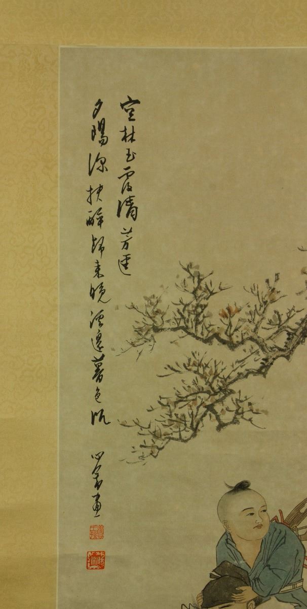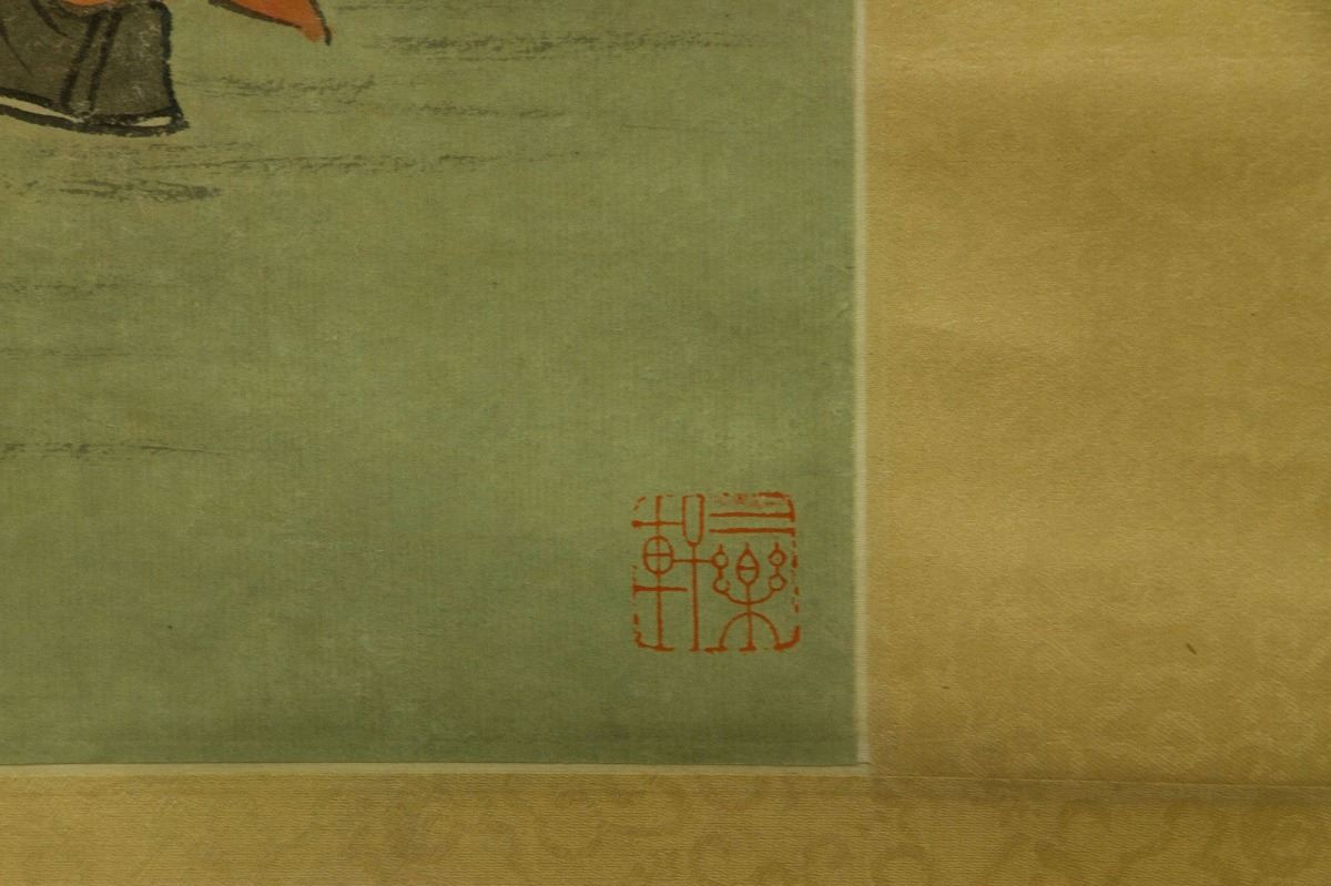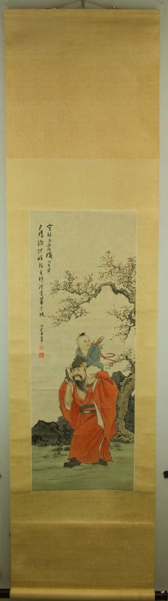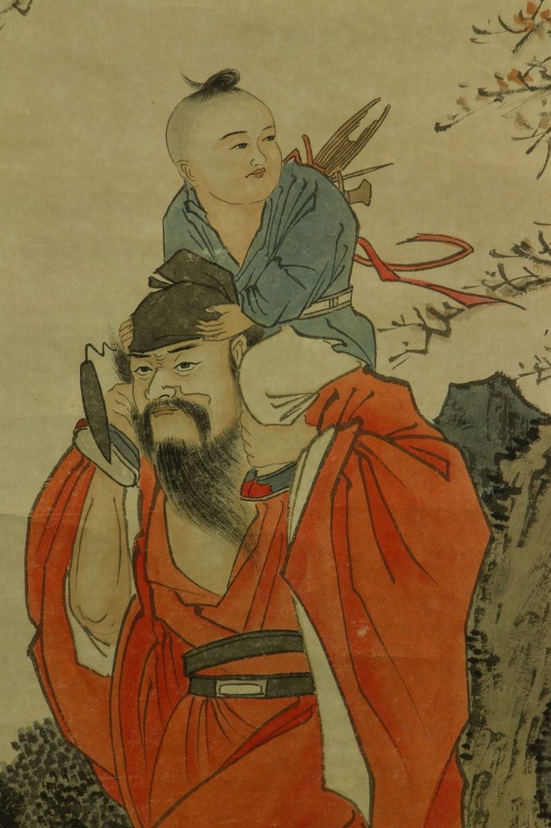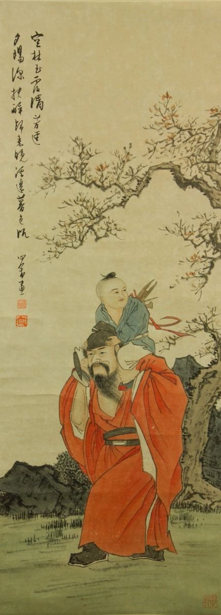 Zhongkui carrying a child; Chinese ink and watercolour on paper; hanging scroll; signed Puru and inscribed with three artist seals; 211 cm × 55 cm