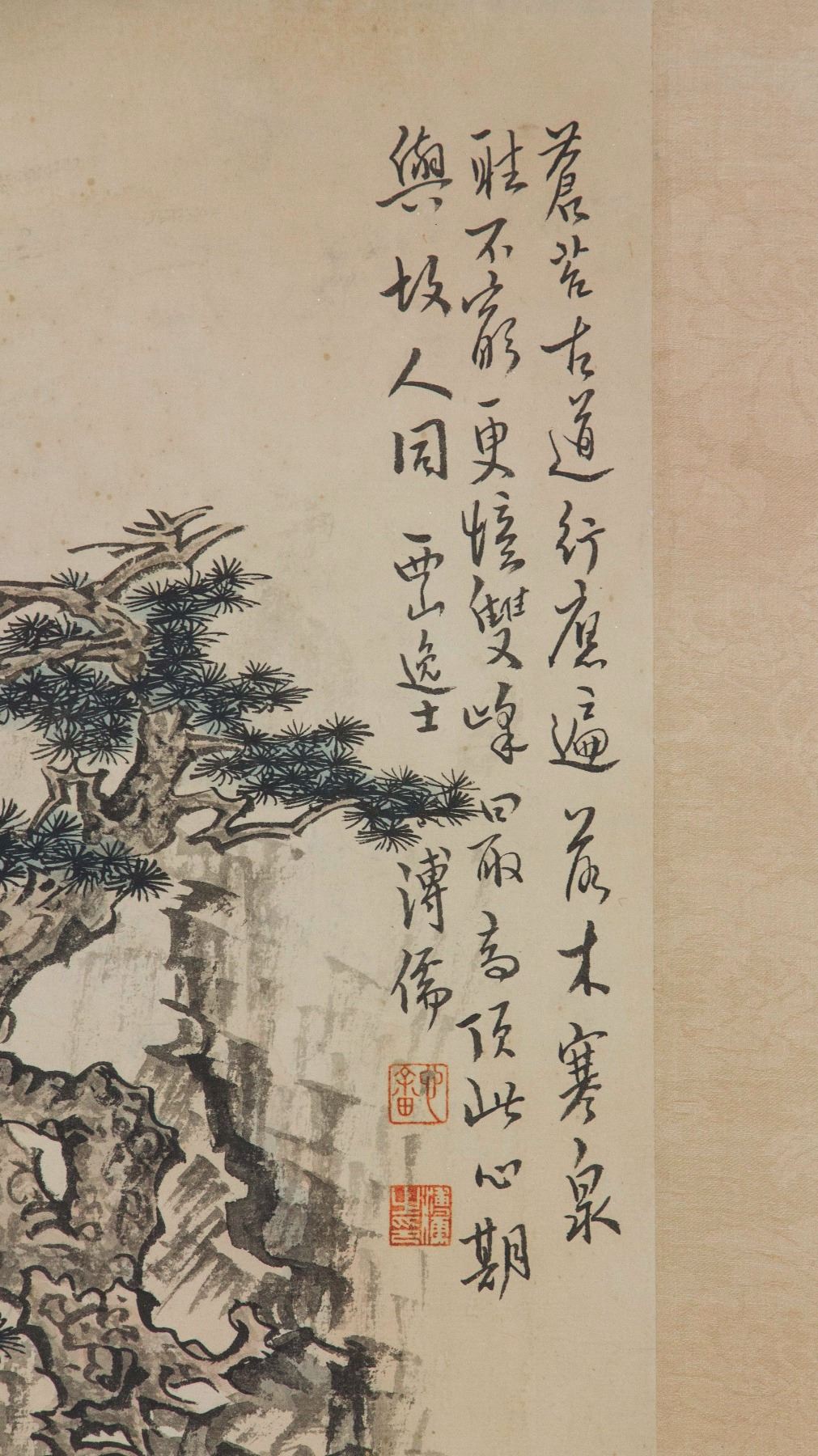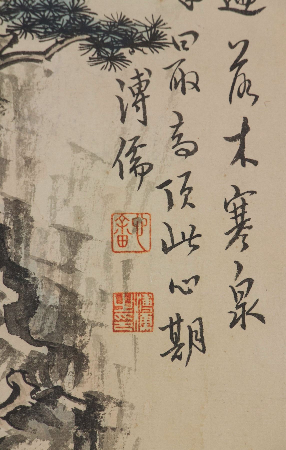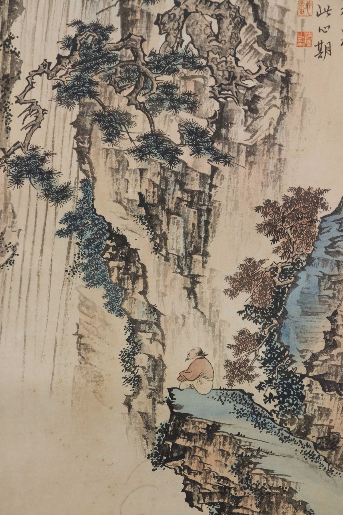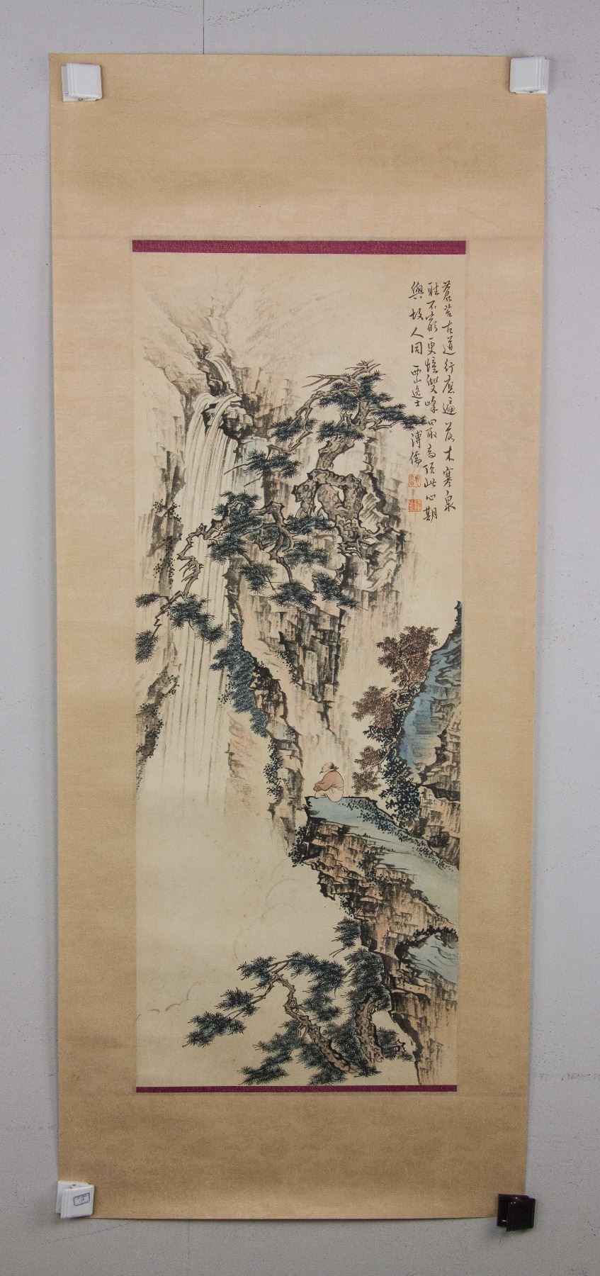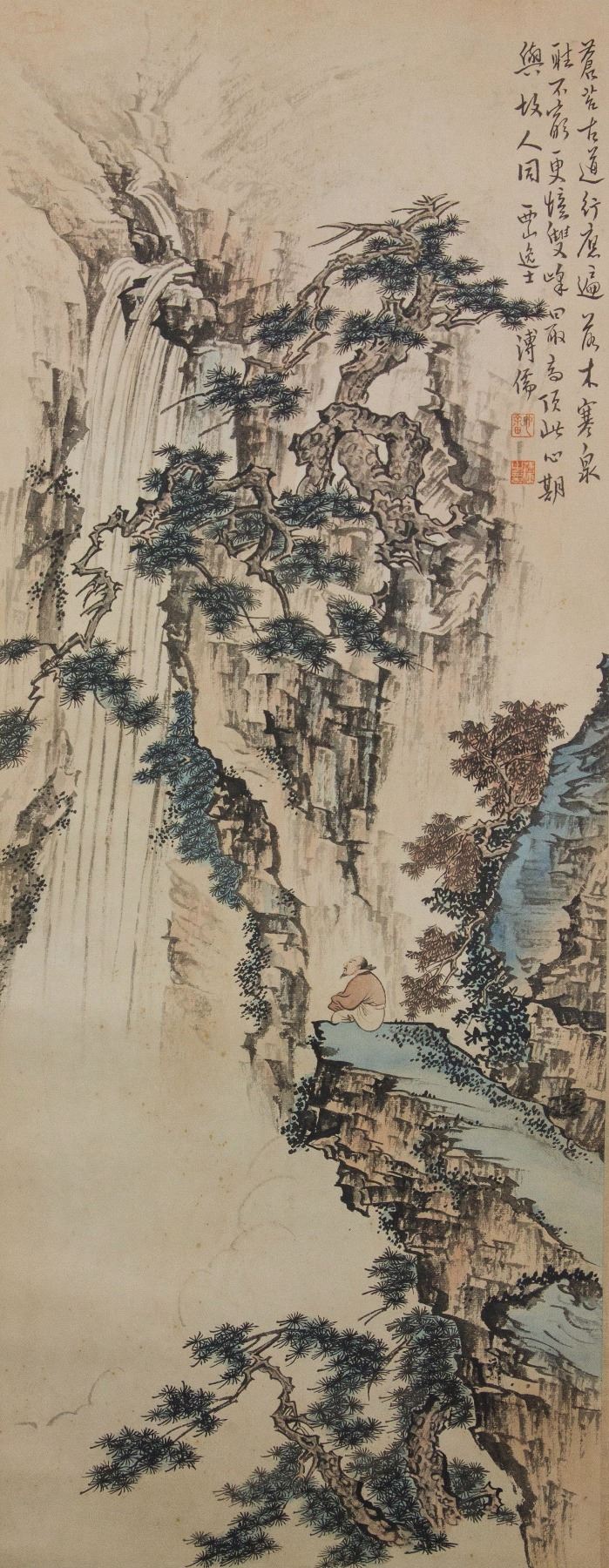 Mountainous landscape with waterfall and hermit; Chinese ink and watercolour on paper; hanging scroll; signed Puru (1896-1963); inscribed with 2 artist seals; 96 cm x 37.5 cm