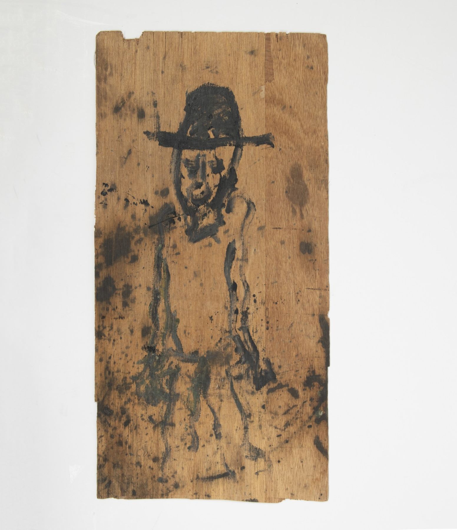 A soulful and raw example of Purvis Young's unmistakable hand, Figure with Hat captures the visceral energy and spiritual immediacy that define the artist's practice. Painted directly onto a reclaimed wood panel, a material central to Young's visual language, this work embodies the artist's poetic dialogue between humanity, struggle, and resilience. Rendered in bold, gestural strokes of dark oil paint, the solitary figure emerges with an aura of mystery and dignity. The broad-brimmed hat, downturned face, and fluid, almost spectral outline recall Young's ability to distill emotion and narrative from minimal form. The weathered surface, with its organic stains and irregularities, serves not only as a support but as an integral element of the composition, a living record of the urban environment that inspired Young's art. Born and based in Miami's Overtown neighborhood, Purvis Young transformed found materials into visual sermons chronicling the human spirit's endurance amid hardship. This unsigned example, acquired from a Miami auction several years ago, bears all the hallmarks of Young's authenticity: immediacy, rhythm, and the unique sense of transcendence achieved through humble means.