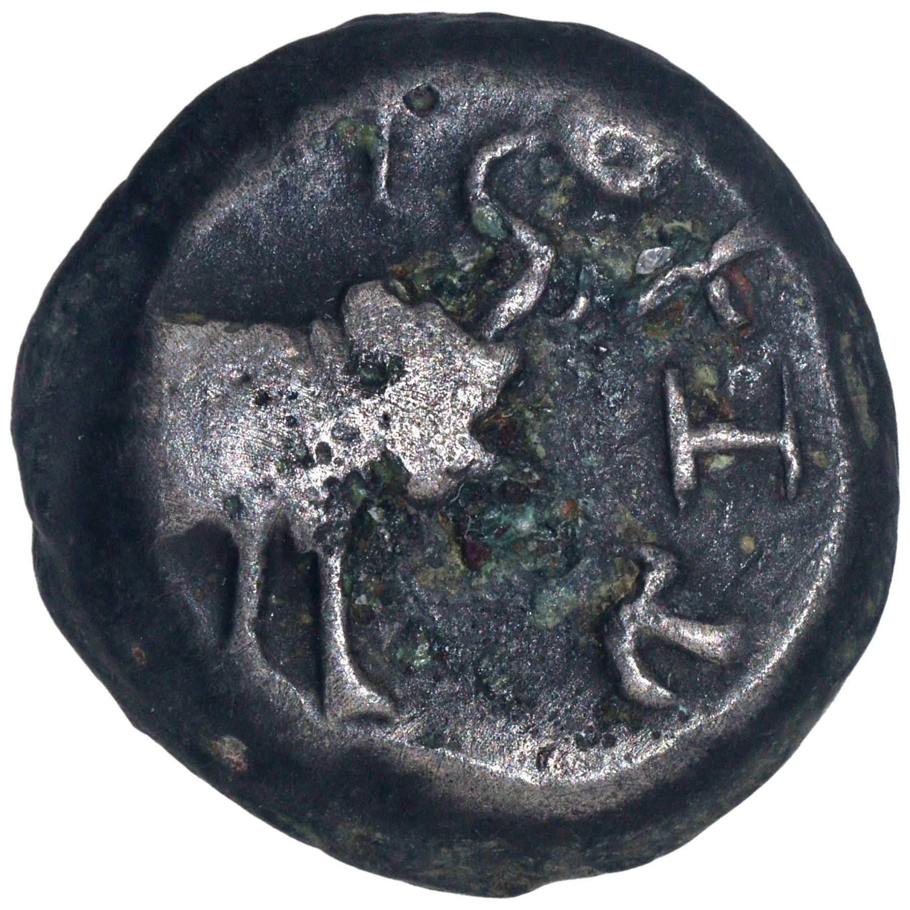 Maharathis of Marathwada (100-200 CE), Pusavaruna, During the Satavahana Era, Copper Base Alloy Unit, Obv: an elephant standing facing right with an upraised trunk, Brahmi legend "(Maharathisa Pu)savarunasa" above, Rev: a railed tree, a hook left and a circle right, 4.8g, 16.24mm, (Unlisted), about extremely fine, Extremely Rare.