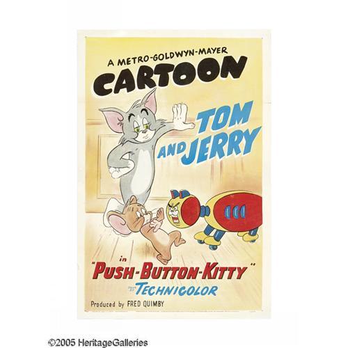 <B>Push-Button-Kitty (MGM, 1951).</B></I> One Sheet (27" X 41"). Mammy Two-Shoes (the voice of Lillian Randolph, in her last appearance in a Tom and Jerry cartoon) has a new robot cat named Mechano -- so she doesn't need Tom around any more. Mechano is particularly adept at tracking down Jerry, so the plucky mouse has to figure out a solution to this computerized cat, pronto! This one sheet has minor corner chips, fold wear with separations and loss of paper, and the upper border has been trimmed. The poster has been mounted on linen and some restoration has been done. There is some separation from the Japanese backing paper, which could be easily repaired. William Hanna and Joseph Barbera created Tom and Jerry along with Fred Quimby. The two animators became so prolific in their productions that they started their own company in 1957. Tom and Jerry cartoons are cultural icons and their posters are very collectible. Very Good/Fine on Linen.