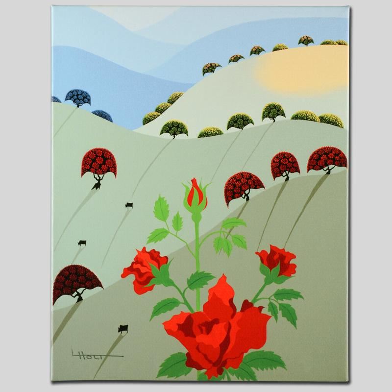 Larissa Holt, a student of distinguished artist Eyvind Earle(1916-2000), uses bold colors and breathtaking scenery to create images of Nature in her own unique style. "Pushing Up Roses" is a limited edition giclee on stretched canvas by Holt, numbered and bearing Holt's authorized signature. This piece comes gallery wrapped. Includes Certificate of Authenticity! Measures approx. 10" x 12.5" x 1.5" (image).