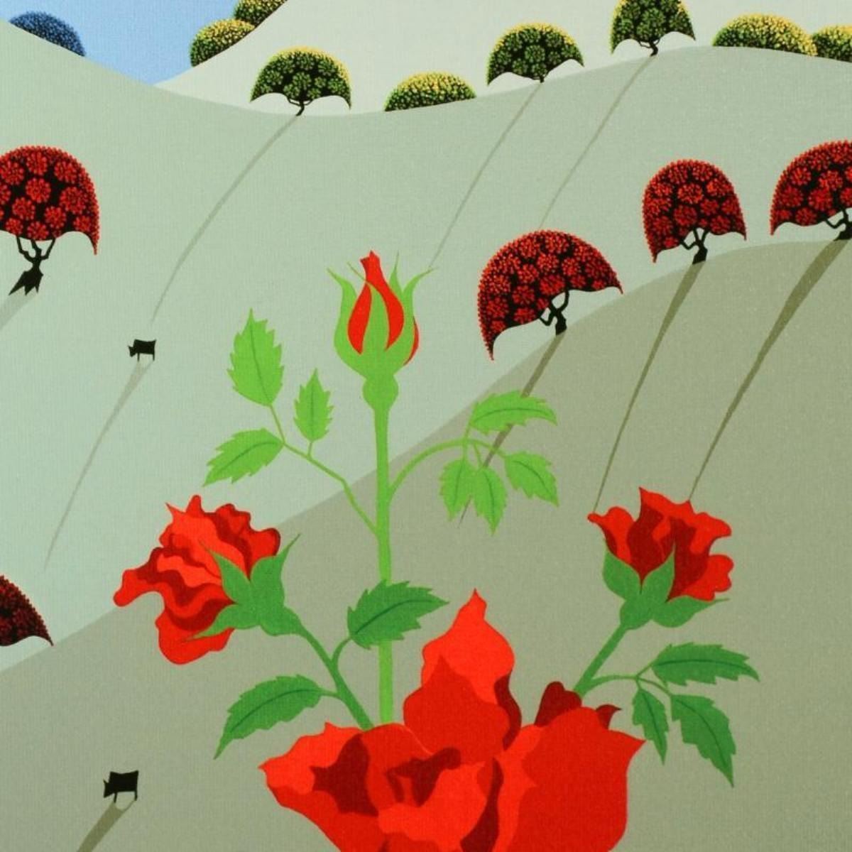 Larissa Holt, a student of distinguished artist Eyvind Earle(1916-2000), uses bold colors and breathtaking scenery to create images of Nature in her own unique style. "Pushing Up Roses" is a limited edition giclee on stretched canvas by Holt, numbered and bearing Holt's authorized signature. This piece comes gallery wrapped. Includes Certificate of Authenticity! Measures approx. 10" x 12.5" x 1.5" (image).