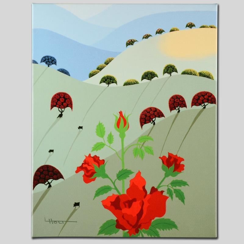 Larissa Holt, a student of distinguished artist Eyvind Earle(1916-2000), uses bold colors and breathtaking scenery to create images of Nature in her own unique style. "Pushing Up Roses" is a limited edition giclee on stretched canvas by Holt, numbered and bearing Holt's authorized signature. This piece comes gallery wrapped. Includes Letter of Authenticity. Measures approx. 10" x 12.5" x 1.5" (image). This item requires special handling and may have a longer than usual turnaround.
