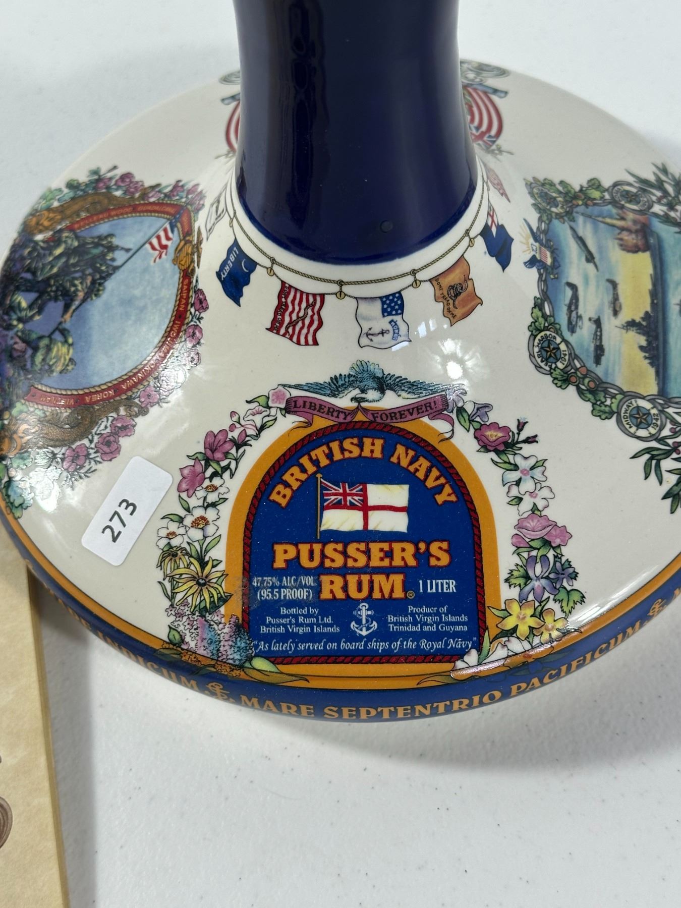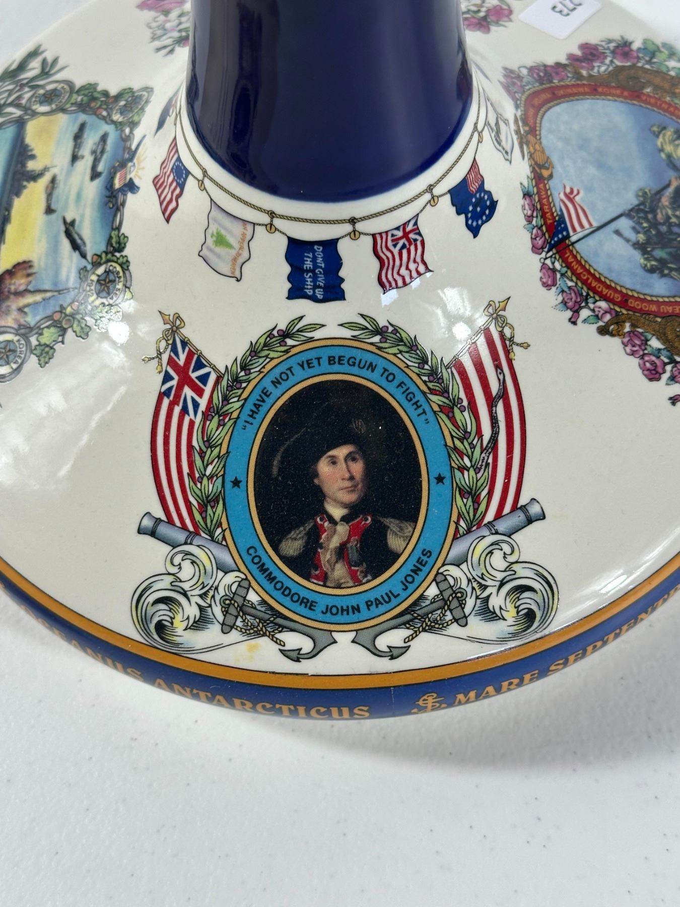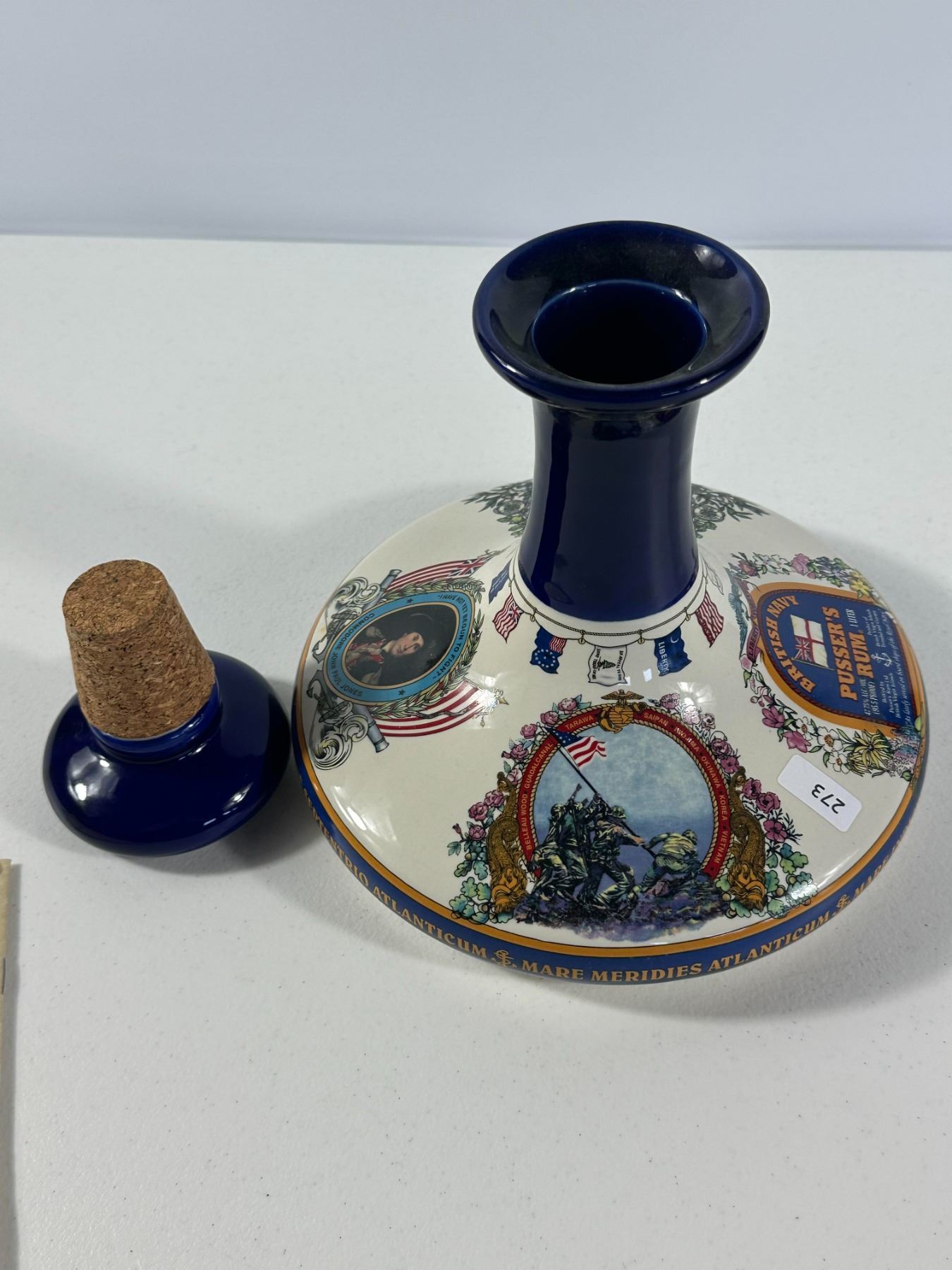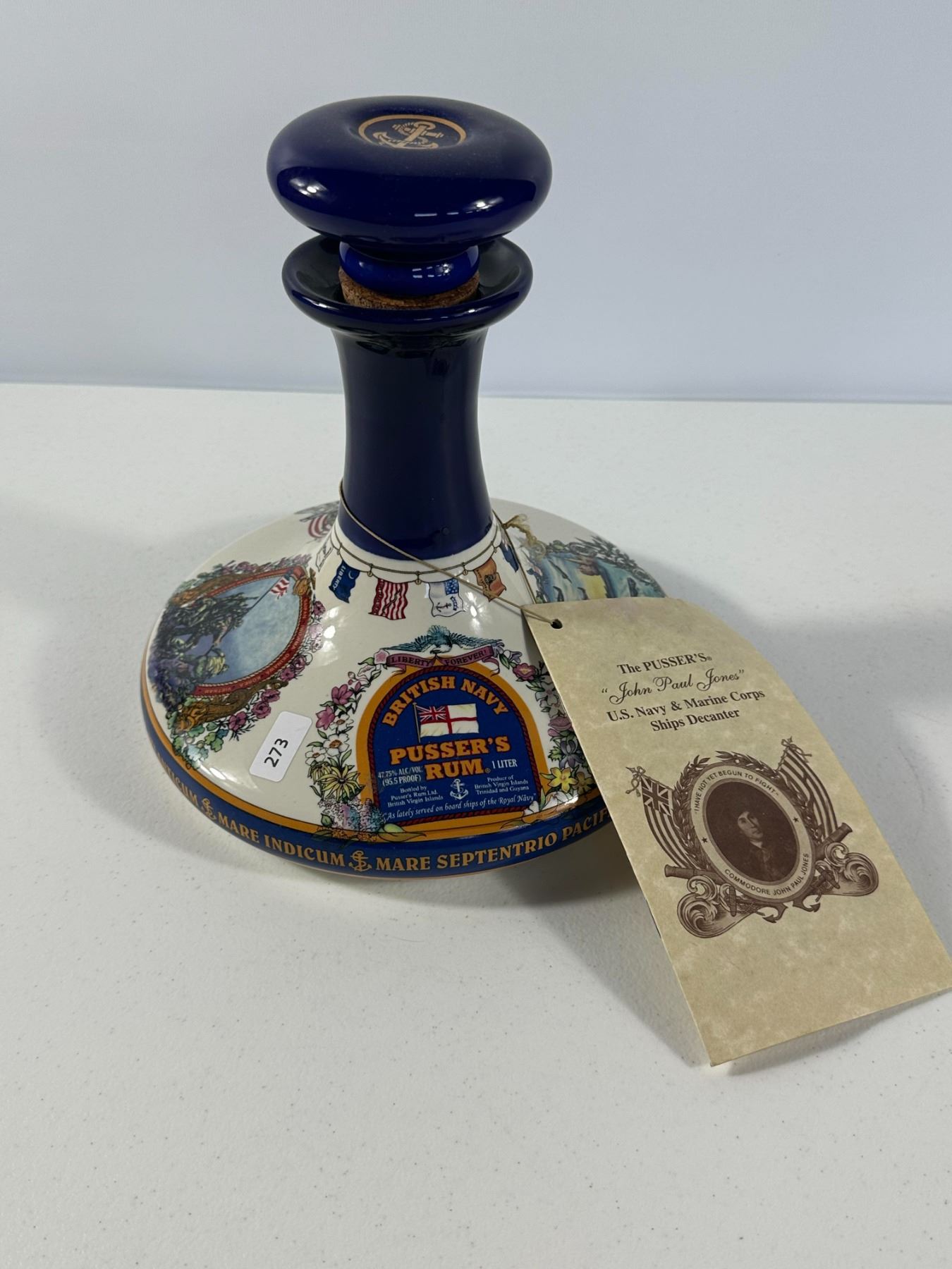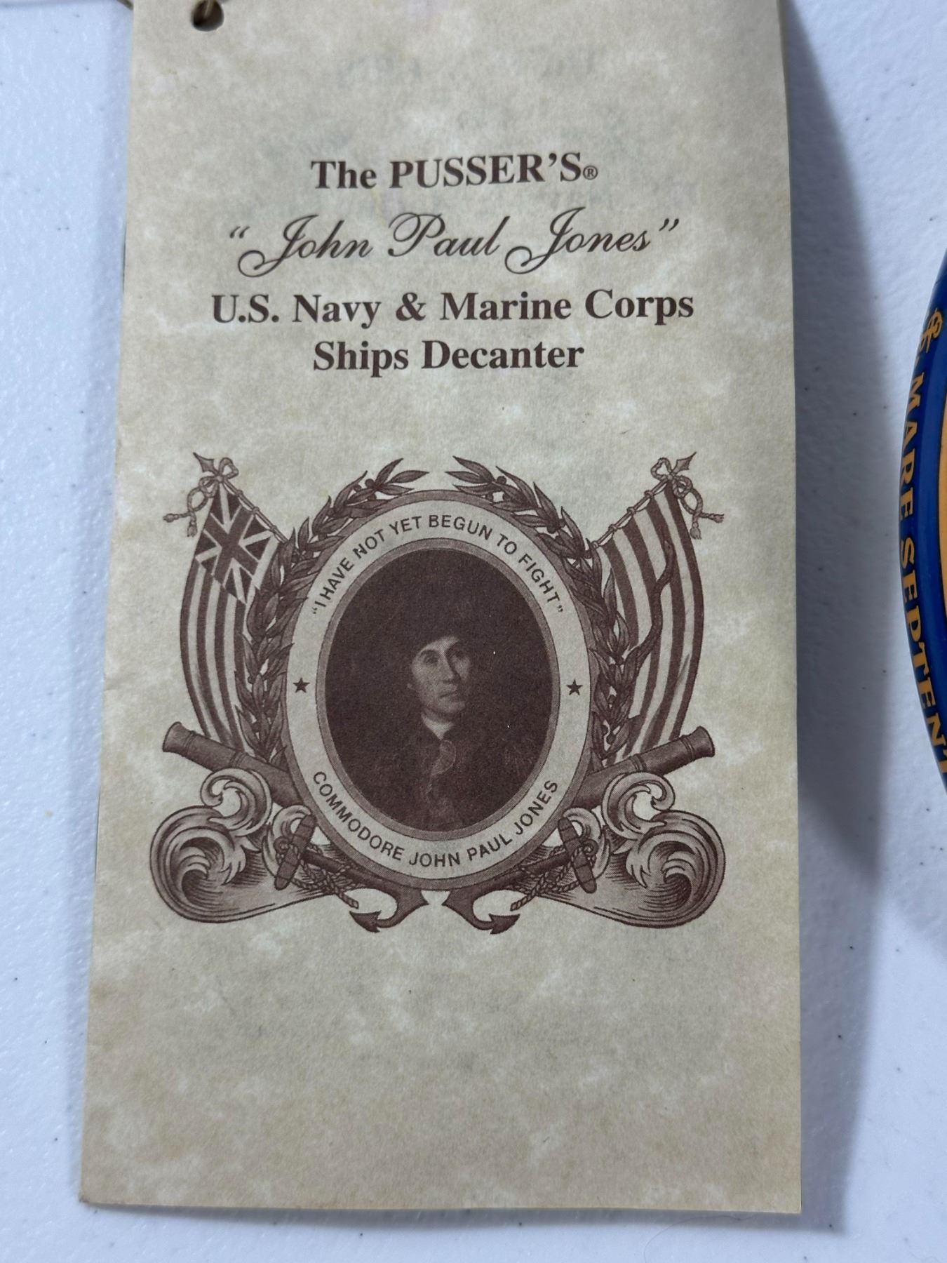 Limited edition Pusser’s British Navy Rum ceramic ships decanter, “John Paul Jones” U.S. Navy & Marine Corps edition. Features colorful maritime artwork, anchor insignia stopper, and original tag. 1 liter size. Decorative collectible honoring naval tradition. Bottle only