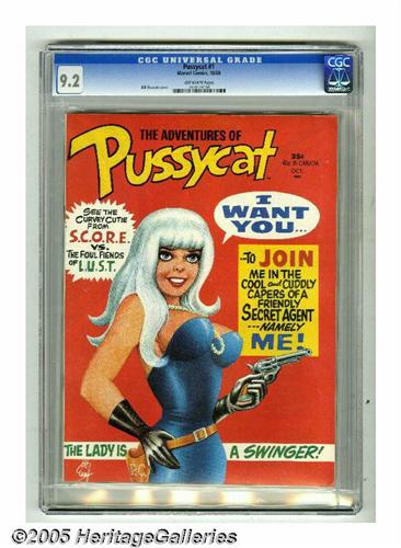 <B>Pussycat #1 (Marvel, 1968) CGC NM- 9.2 Off-white pages.</B></I> Called "scarce" by Overstreet. Bill Everett cover. Everett, Bill Ward, and Wally Wood art. Overstreet 2005 NM- 9.2 value = $265. CGC census 1/05: 2 in 9.2, none higher. <I>From the collection of Chris Bell.</B></I>