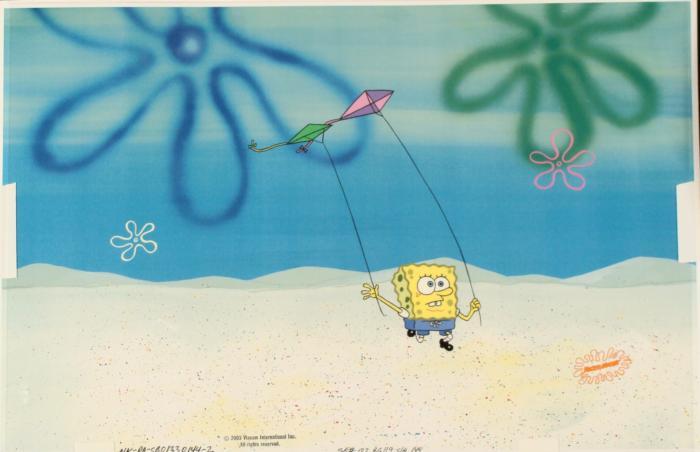 This animation cel and reproduction background are from the Nickelodeon TV show SpongeBob Squarepants. The story takes place under the deep blue sea in Bikini Bottom, where SpongeBob resides. SpongeBob, who is a yellow, porous sponge, is your typical happy-go-lucky character, as he is always cheerful and enjoys making people laugh. Patrick Star, SpongeBob's neighbor who is a starfish, is your average children's show idiot, as he boasts knowing nothing and is often getting himself into ridiculous situations. Between the homes of these two lies the home of the miserable Squidward, a squid, who is known for being grouchy and playing tricks on SpongeBob and Patrick. Both SpongeBob and Squidward work at the Krusty Krab, a fast food business run by the greedy money-loving Mr. Krabs, a crab, the arch rival of the evil, possibly misunderstood, Plankton. Another neighbor, Sandy Cheeks, an athletic squirrel who normally wears an astronaut's space suit, was introduced in "Tea at the Treedome." She spends most of her time inventing and experimenting. SpongeBob is putting back the kites.Original Printed Background and Animated Cel Overall Size of Background: 11" x 17" Overall Size of the Cel: 11" x 16 1/2" Very good condition This is an original hand-painted cel set-up used in the production of an episode of "SpongeBob SquarePants." Each one-of-a-kind set-up represents a slight change in position of the characters. When individually photographed and projected in rapid succession, the images appear to move.