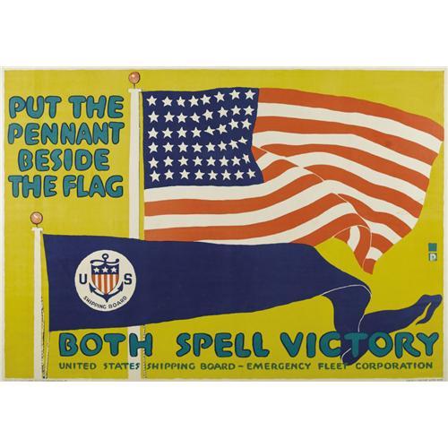 <B>Put the Pennant Beside the Flag.</B></I> 56" x 40", Artist: Unknown. Printed for the United States Shipping Board and the Emergency Fleet Corporation, this poster exhorts that by supporting and providing a strong naval system the war would be won. Before the war, America did not have a strong naval force, but after the call for more ships and defense was raised, we rallied to the call and now posess one of the finest fleets in the world. The U.S. Shipping Board is largely responsible for this, as well as, posters like this one which urged the American people to give everything they had. <BR><BR>Condition: Extra Fine - near mint; linen backed.