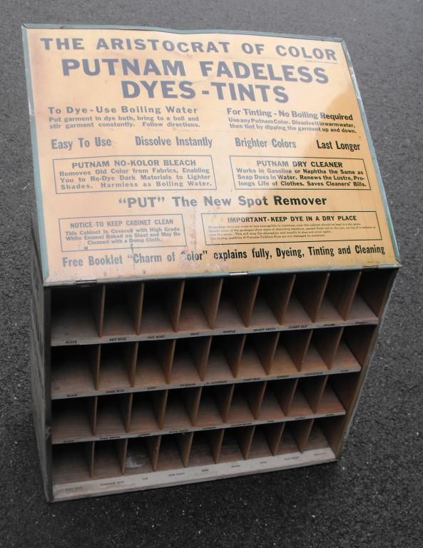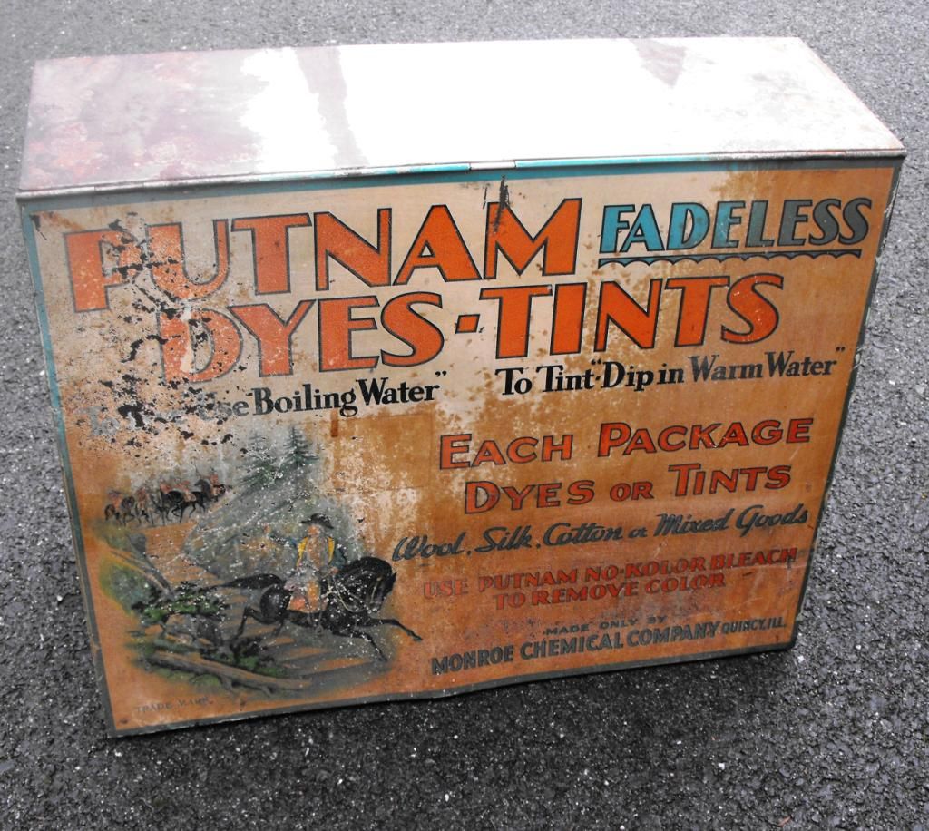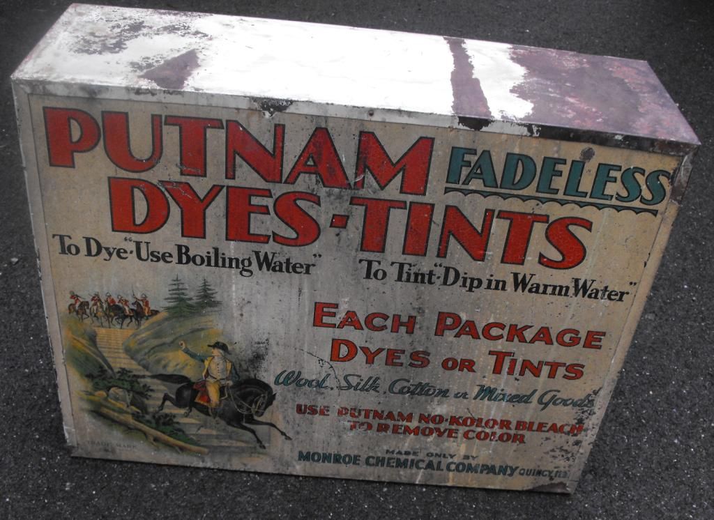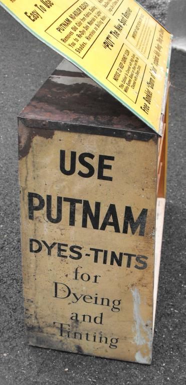 A tin advertising display for Putnam Dyes. 30 x 20 x 8. Highly collectible item. $ 38 SHI lower 48 states.