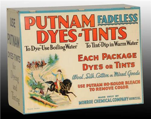 Description 1940s to 1950s. Nice tin litho on two sides with printing on ends. Clean bright example with only a few light scratches, minor marks and wear. Dye Cabinet Condition (8.0 - 8.5, Excellent). Size 19" x 15" x 7".