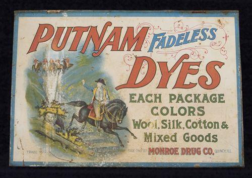 Putnam Fadeless Dyes Box. 11" x 16" x 8". Fabulous designs on front and back. 19th century. From reservation trading post. Good condition. (est $400-500)
