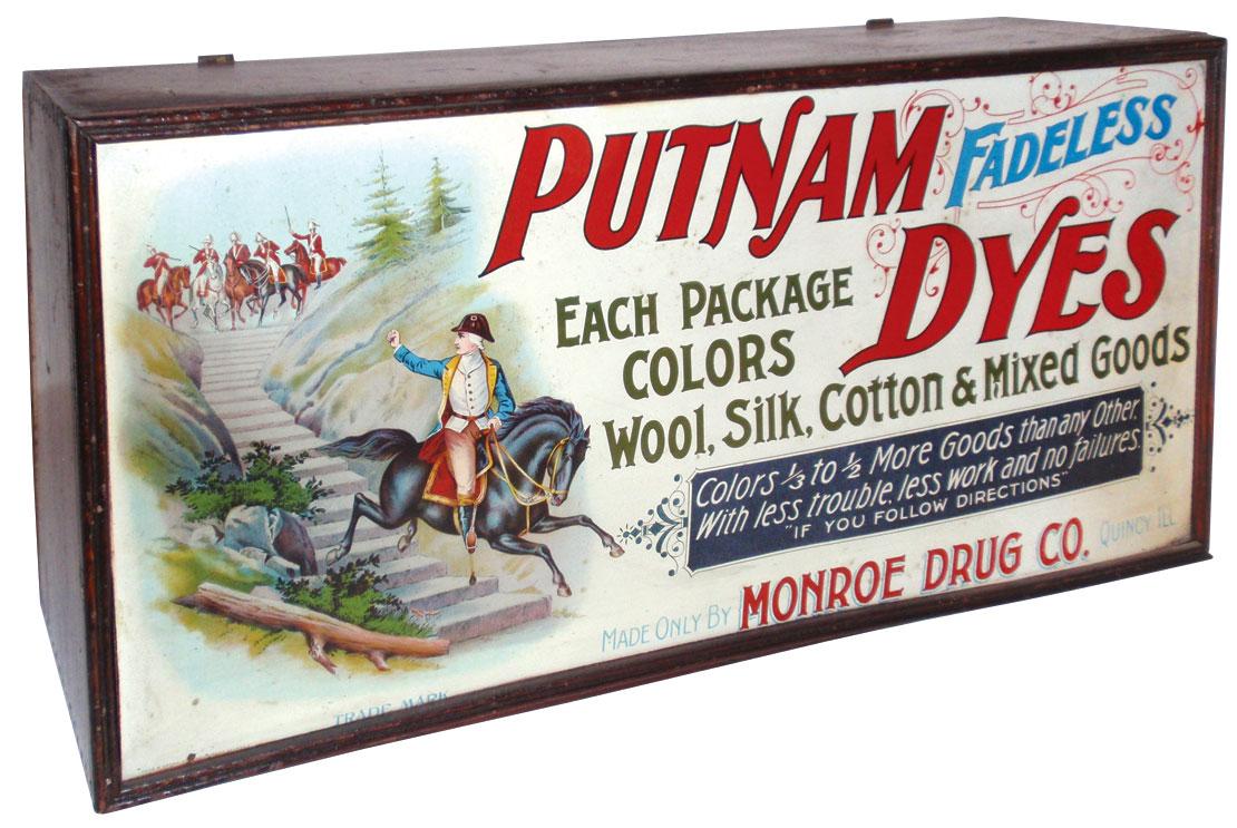 Putnam Fadeless Dyes cabinet, wooden dovetailed counter display w/litho on tin front & back panels, litho on paper interior panel, from Monroe Drug Co.-Quincy, IL, front panel is Exc, rest in VG cond, 11"H x 21"W.