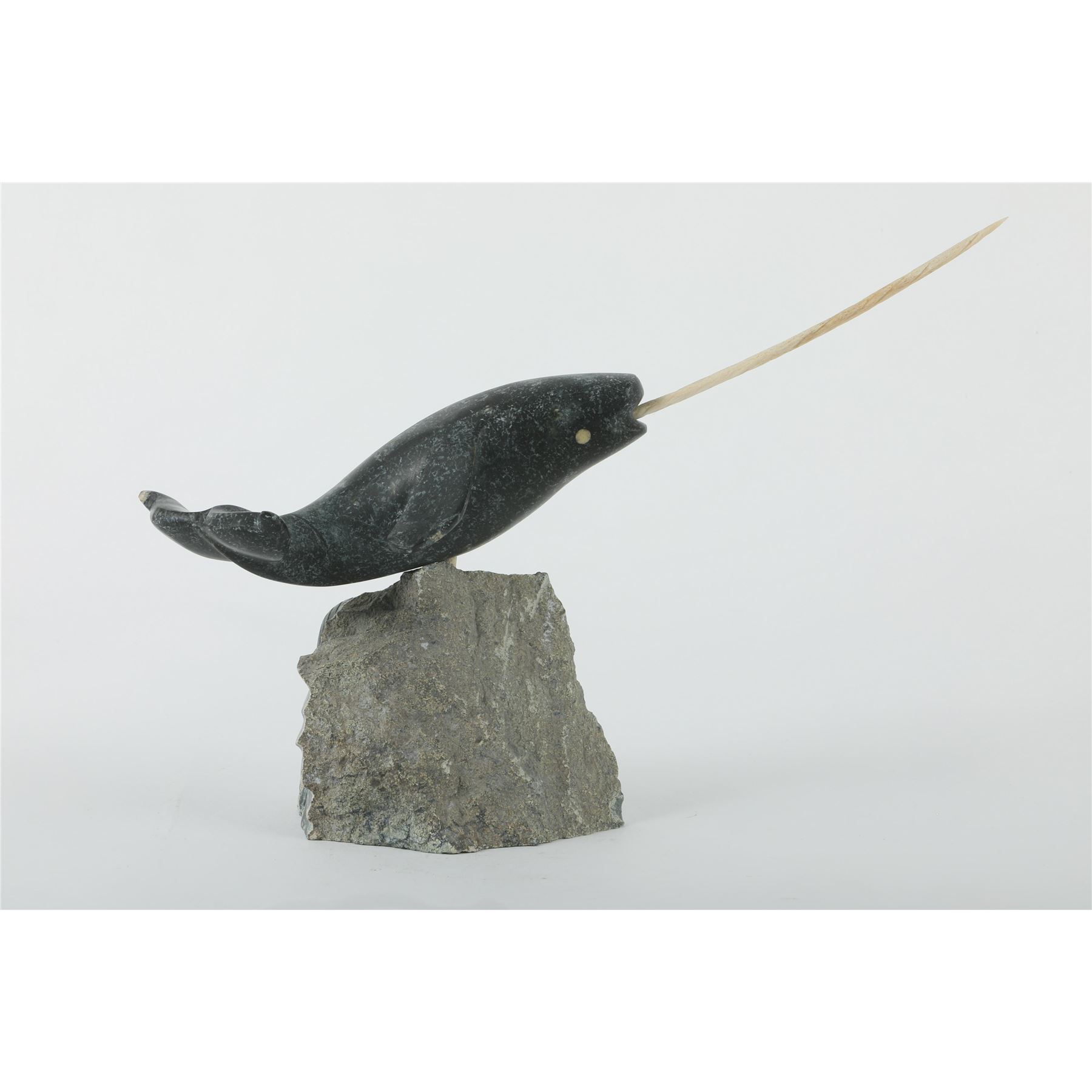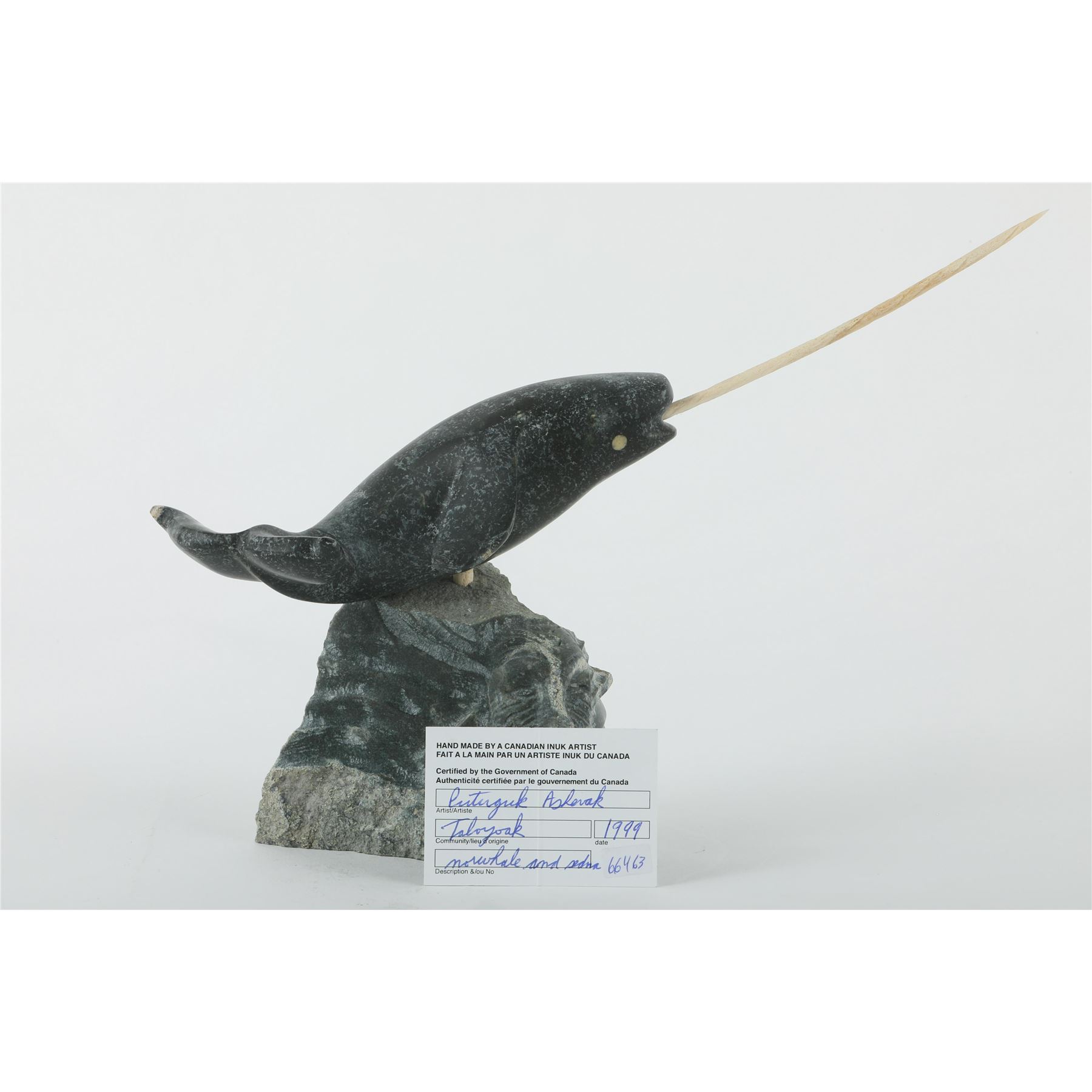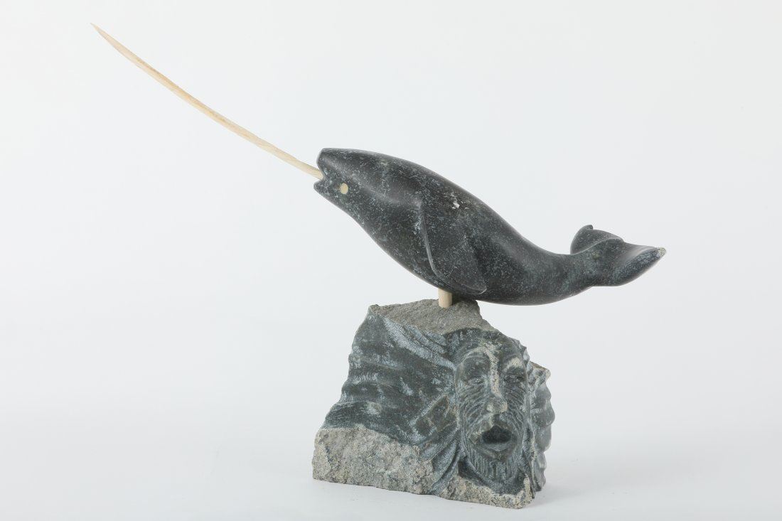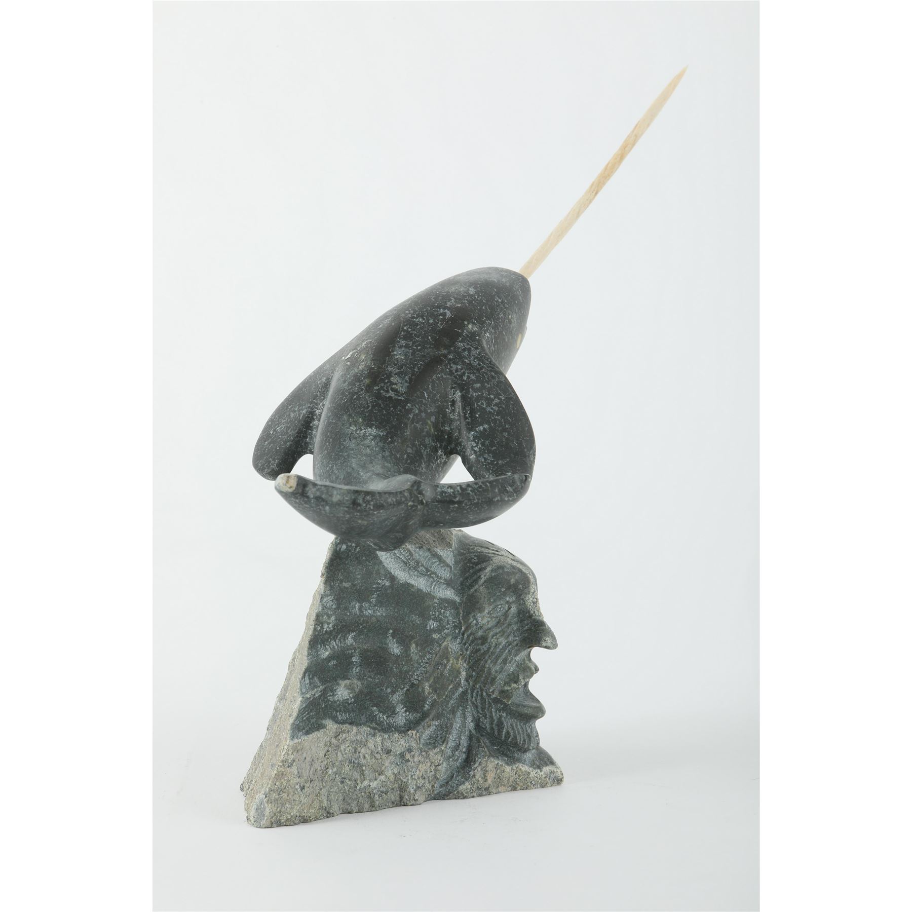 Putuguk Ashevak's "Norwhale and Sedna" original Inuit sculpture. Carved from stone in 1999 from the community of Taloyoak. Included with its certificate of authenticity from the Government of Canada. Retail price of $950. 66463. 6 1/2" x 4" x 6 1/2" tall (without mouth piece)