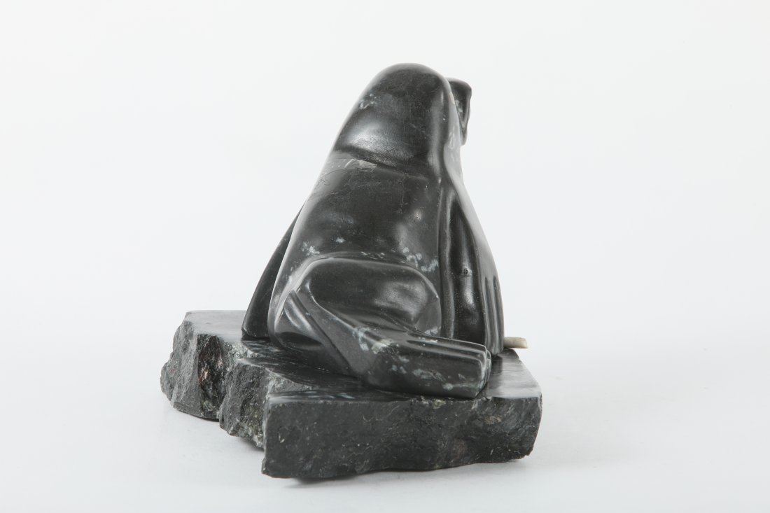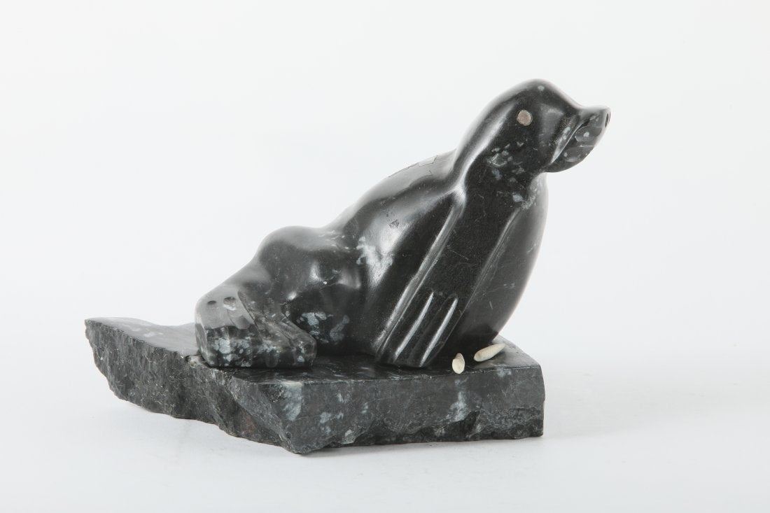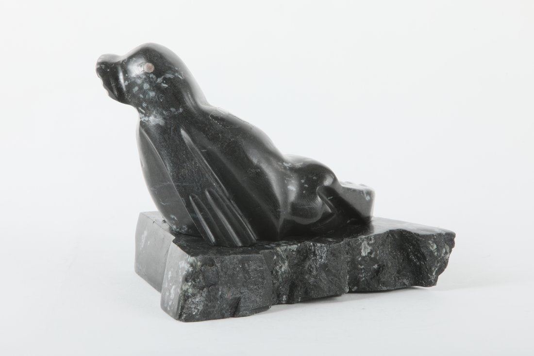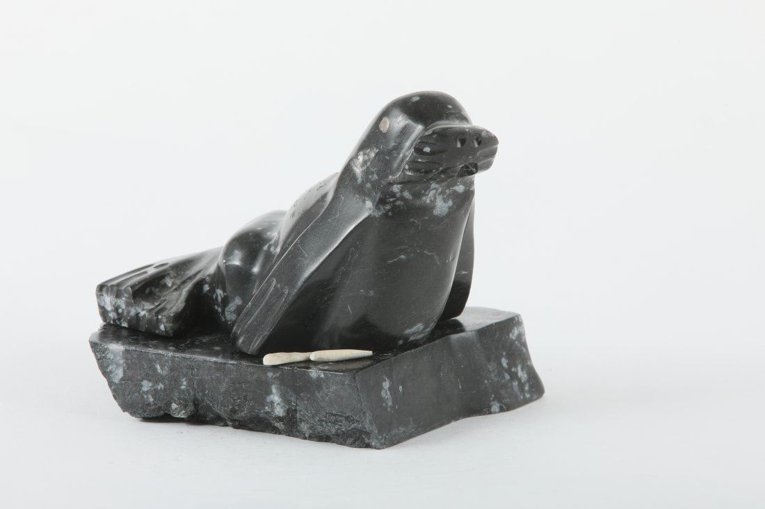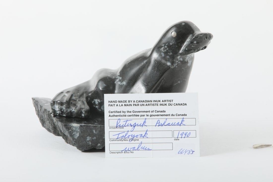 Putuguk Ashevak's "Walrus on Base with Tusks" original Inuit sculpture. Carved from stone in 1990 from the community of Taloyoak. Included with its certificate of authenticity from the Government of Canada. Retail price of $480. 66485. 5 1/2" x 4" x 4" tall.