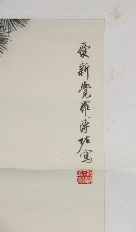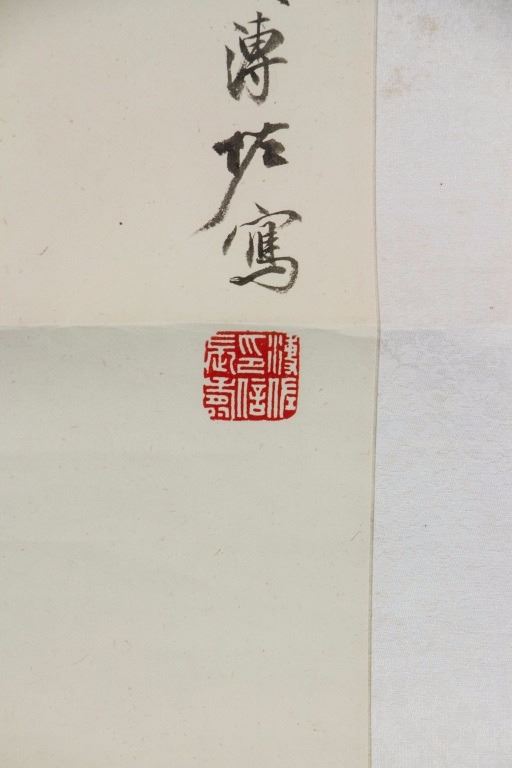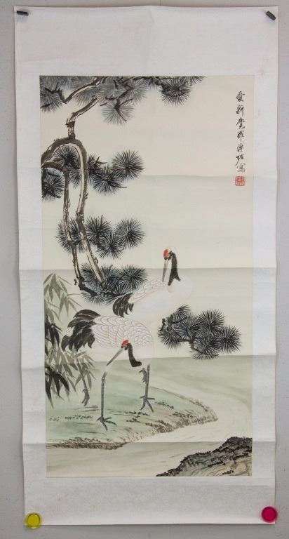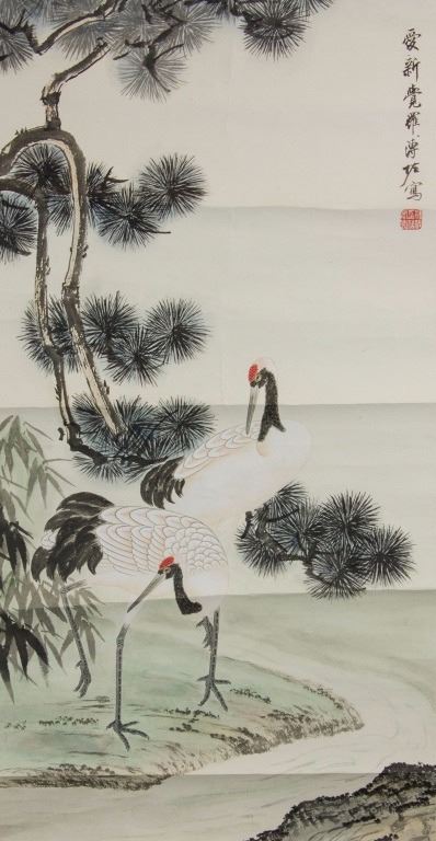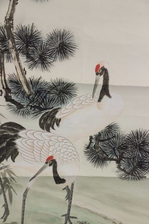 Painting of cranes and pine tree; Chinese ink and watercolour on paper roll; signed Puzuo (1918-2001); inscribed with 1 artist seal; 97 cm x 50 cm