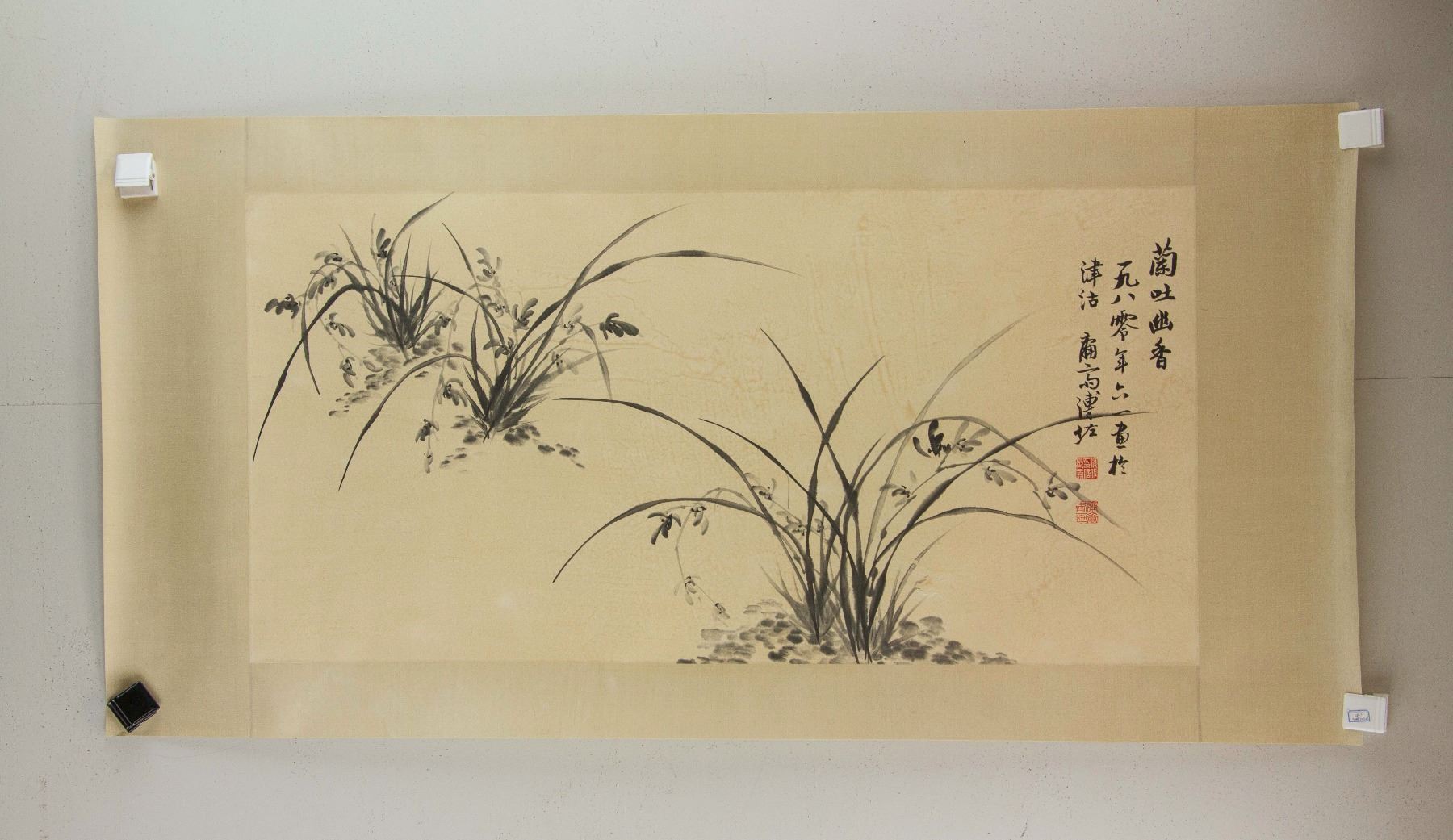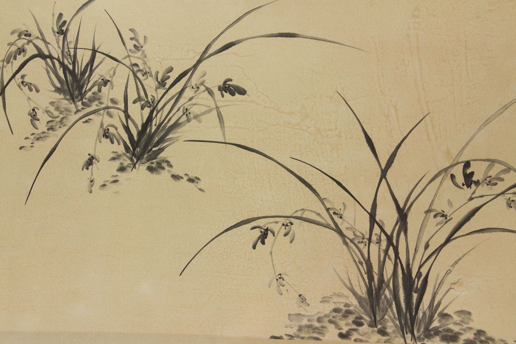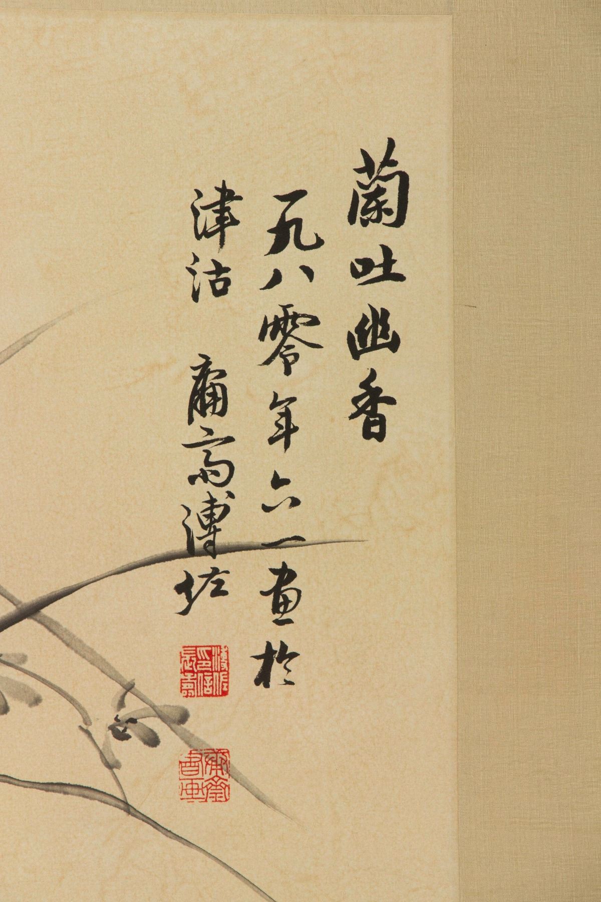 Painting of orchid flower; Chinese ink on paper roll; signed Puzuo (1918-2001); inscribed with 2 artist seals; 77.5 cm x 95 cm