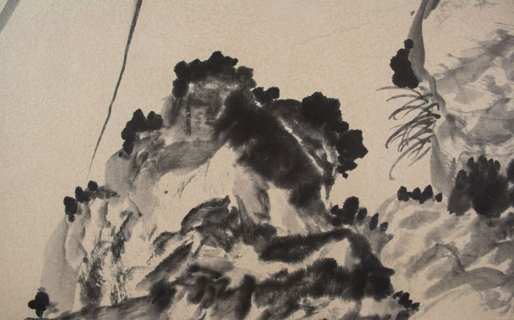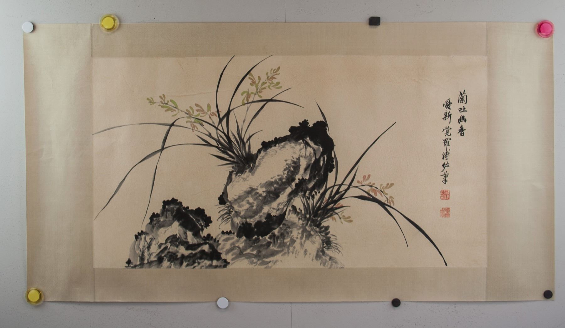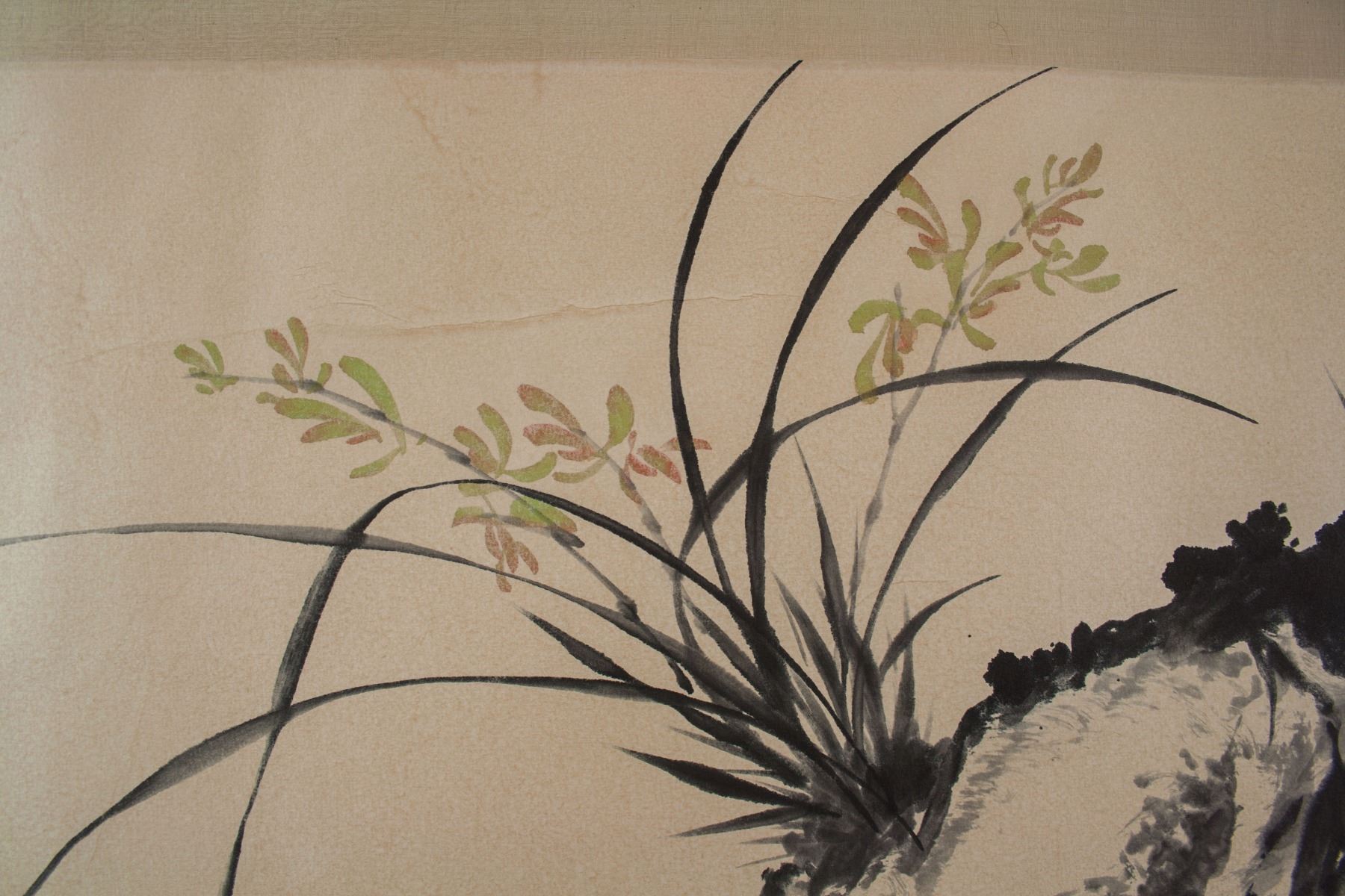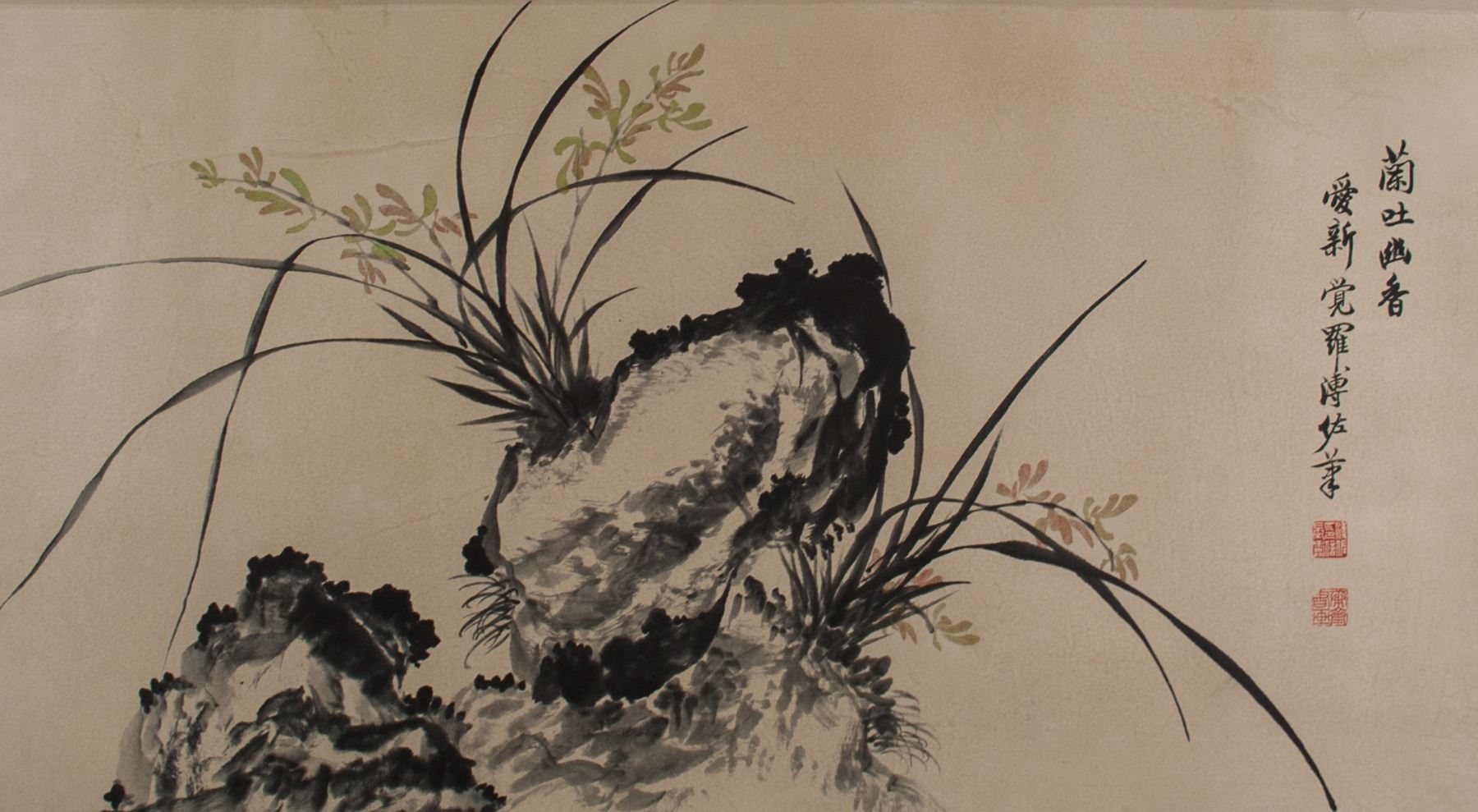Orchid and craggy rock; Chinese ink and watercolour on paper roll; signed Puzuo (1918-2001); inscribed with 2 artist seals; 48 cm x 88 cm
