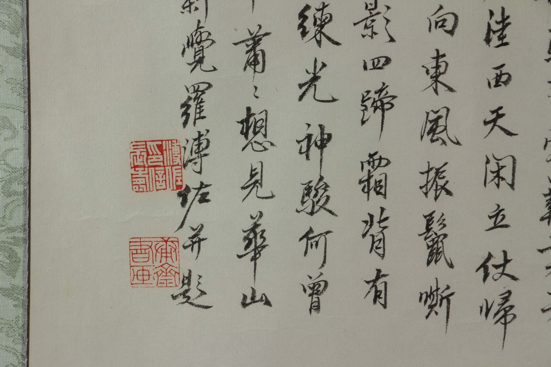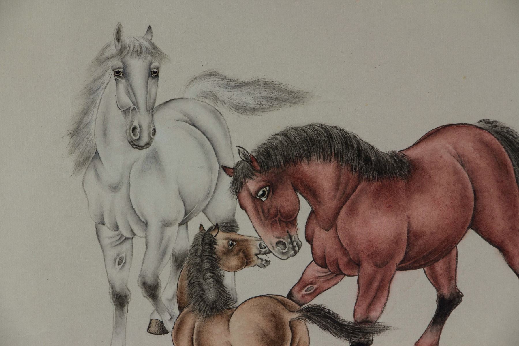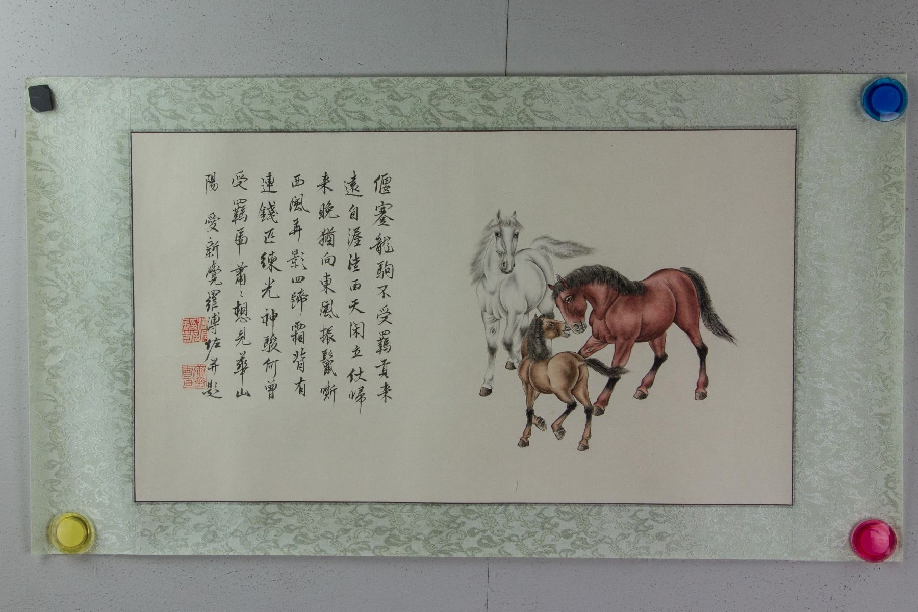 Painting of three horses and Chinese calligraphy; Chinese ink and watercolour on paper roll; signed Puzuo (1918-2001); inscribed with 2 artist seals; 34.5 cm x 62 cm