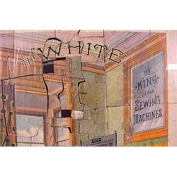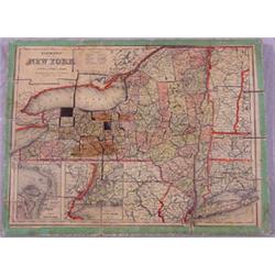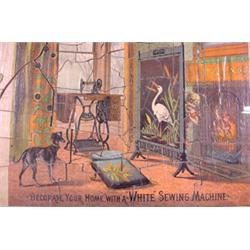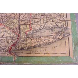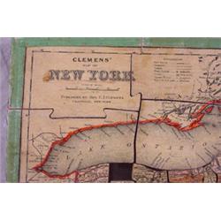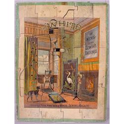 Advertising colored lithograph New York State puzzle map, Ca. 1880; side one features a detailed map of New York with each county being a separate puzzle piece; titled "Clemen's Map of New York"; reverse side is a very colorful advertisement for "White Sewing Machine" and shows a Victorian interior with sewing machine, dog & roaring fire; 2 puzzle pieces are missing; overall dirt & abrasions; no box; 16" tall x 12" wide.